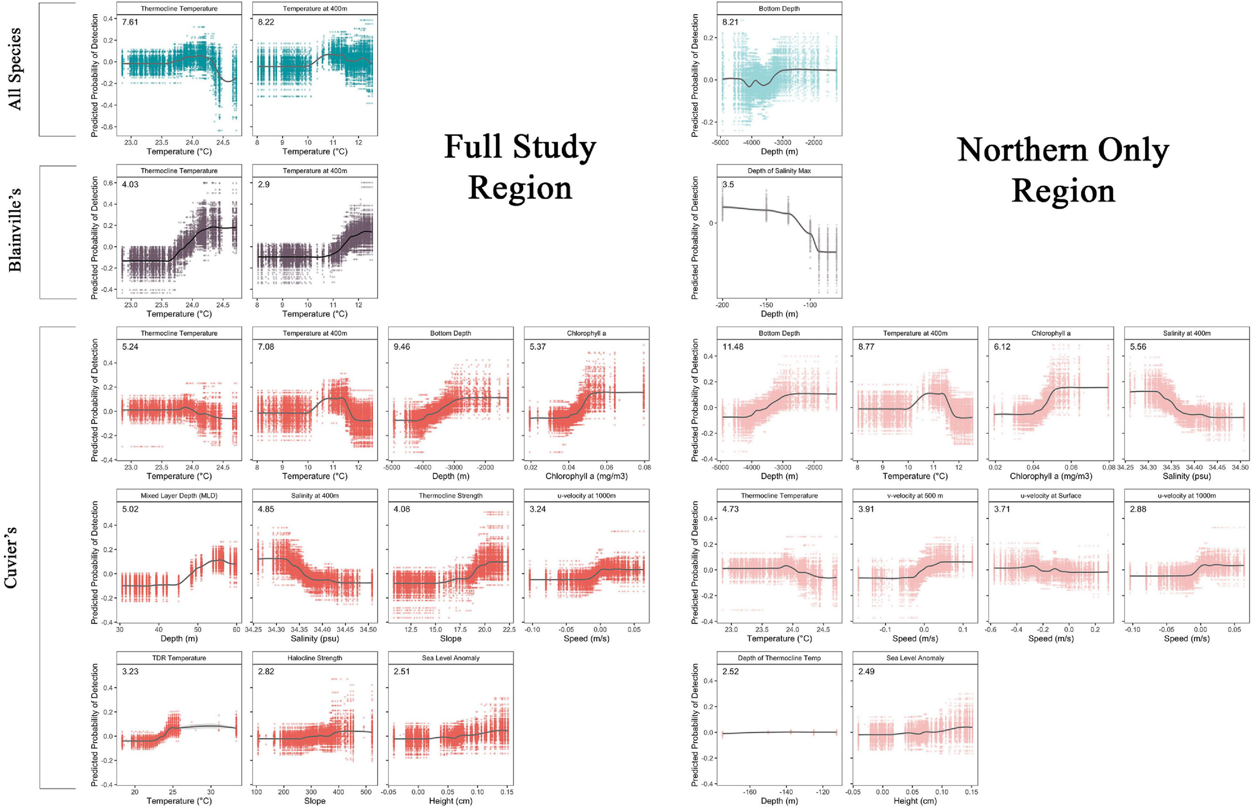 The six ERF analyses performed with varying success; the highest TSS and AUC (0.68 and 0.93) values for the ERF model included only Cuvier’s beaked whale (Table 4).