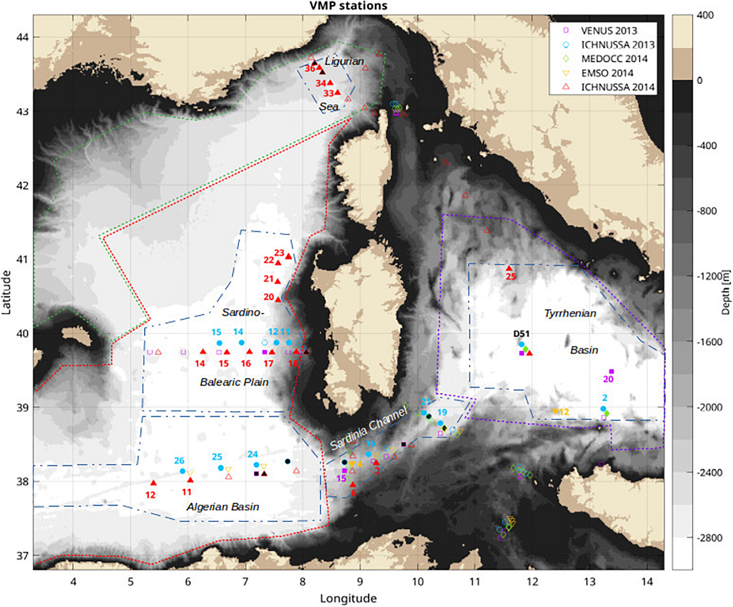 Location of VMP stations gathered along five cruises done in 2013 and 2014. Each cruise has specific color and marker. For clarity, markers are offset around the VMP cast location to distinguish between cruises for a same station. When staircases with clear alternating steps and layers are observed on a profile, the marker is filled with the corresponding cruise color. Markers filled with black correspond with stations showing some smooth or fuzzy staircases that are not taken into account in this study. Unfilled markers are stations without any obvious staircases. Note that the numbering of a same station usually differs from a cruise to the other. Blue dashed-dotted lines delineate the maximum area attributed to the four regions showing staircases. The area of the Algerian Sea extends up to the Alboran Sea and that of the Tyrrhenian Sea extends slightly further eastward (cut for clarity). Colored dotted lines are used to delineate regions for mechanical mixing estimates: red for the Algerian Sea to the Northern boundary layer, green for the boundary layer, purple for the Tyrrhenian Sea, Sardinia Channel remains delimited by the blue dashed-dotted line.