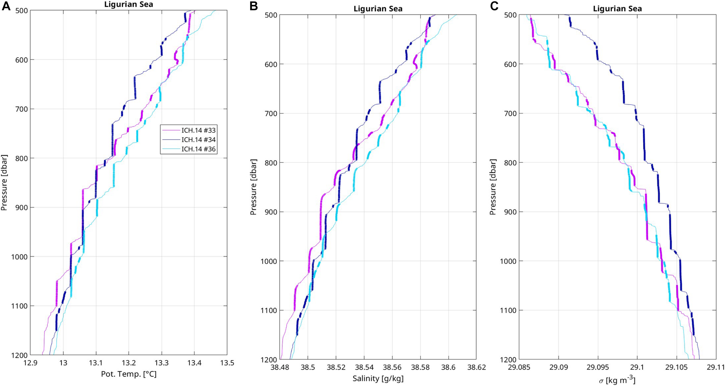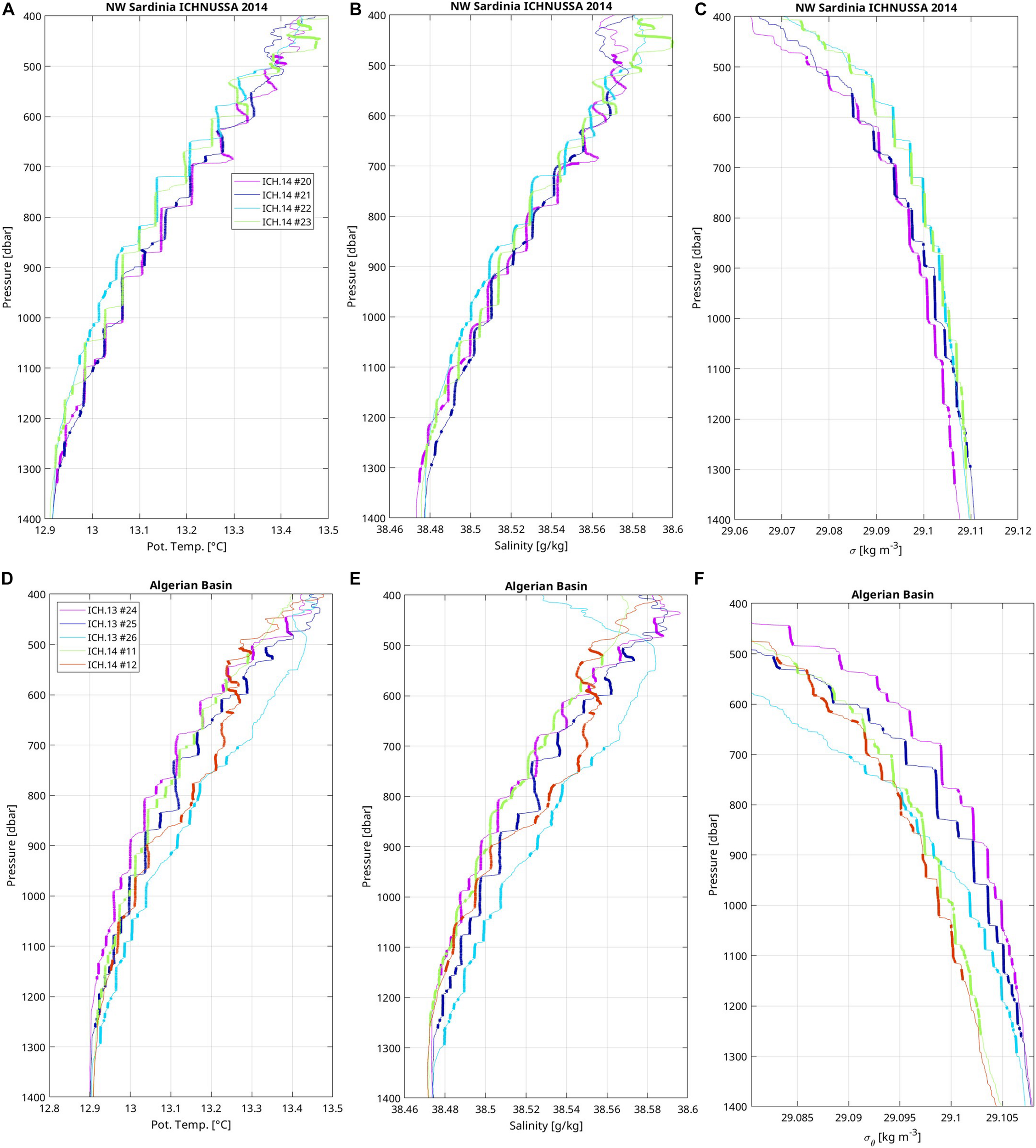 During fall 2014, staircases are observed exceptionally as far north as to 41°N, off the western coast of Sardinia (Figure 1, sta. #20-23). They share many common characteristics with staircases located further south along the Minorca-Sardinia transect. For instance, many steps and layers of profiles ICH. 14 #20 and #22 (Figures 3A–C) show temperature-salinity properties close to those of ICH. 14 #15 and #16 (Figures 2D–F); layers and steps are often simply offset in pressure by few tens of dbars. Statistics on layer thicknesses are also similar to the fall 2014 Minorca-Sardinia transect with 23% of the layers having a vertical extent larger than 60 dbar. Those large-scale coherent observations are consistent with the large spatial coherence usually observed in staircases that can reach several hundreds of kilometers. Here, the distance between ICH. 14 #15 and #22 amounts to 153 km.