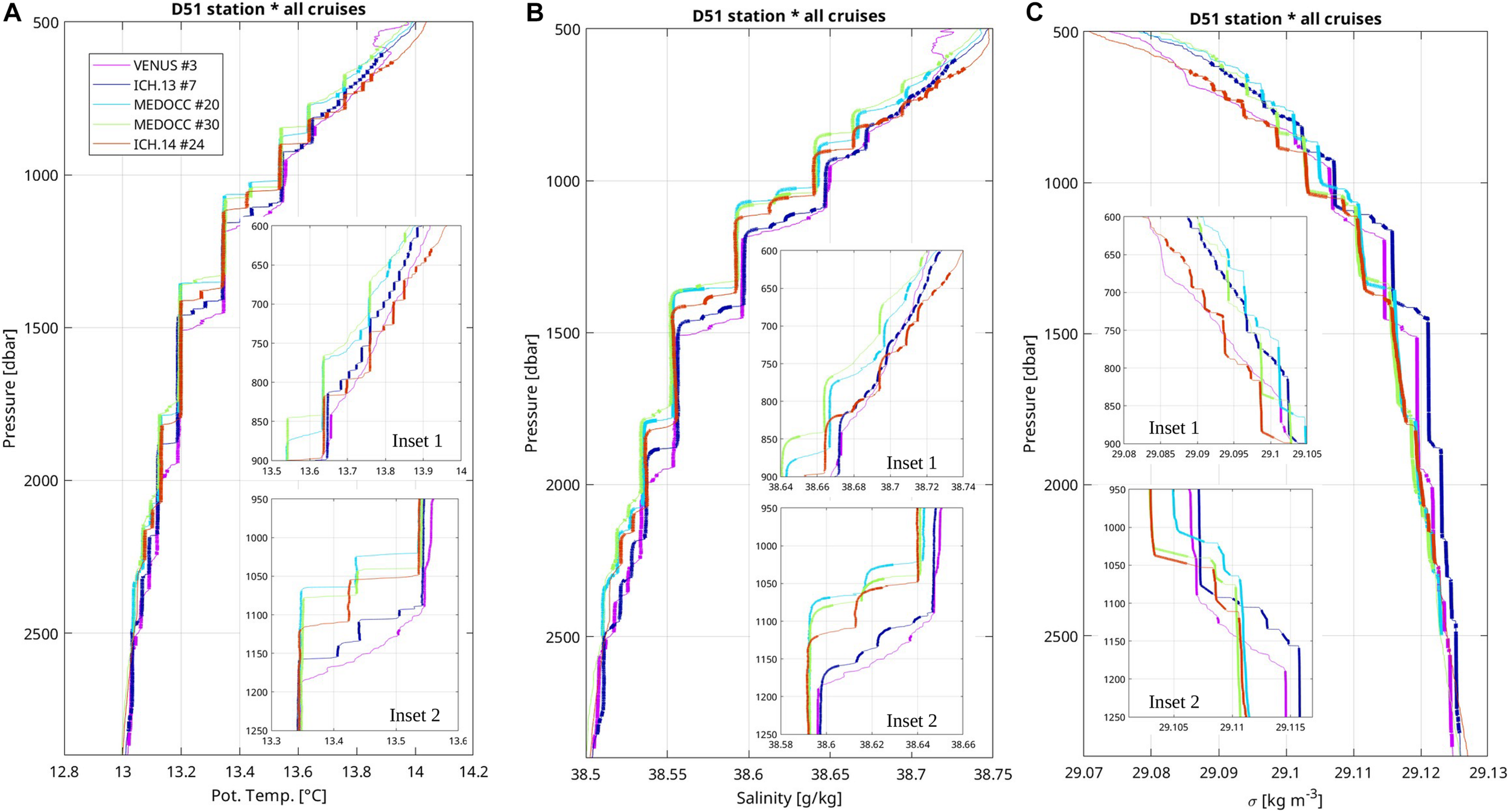 Repeated vertical profiles of (A) potential temperature, (B) salinity, and (C) potential density at the D51 station located in the Tyrrhenian sea during four cruises in 2013–2014. Cruise names are indicated in the legend. Note that two realizations were done during the MEDOCC 2014 spring cruise. The D51 station is located on the map (Figure 1). Layers are emphasized by thick lines with weak vertical gradient segments. Insets 1 and 2 shows enlargements of the profile.