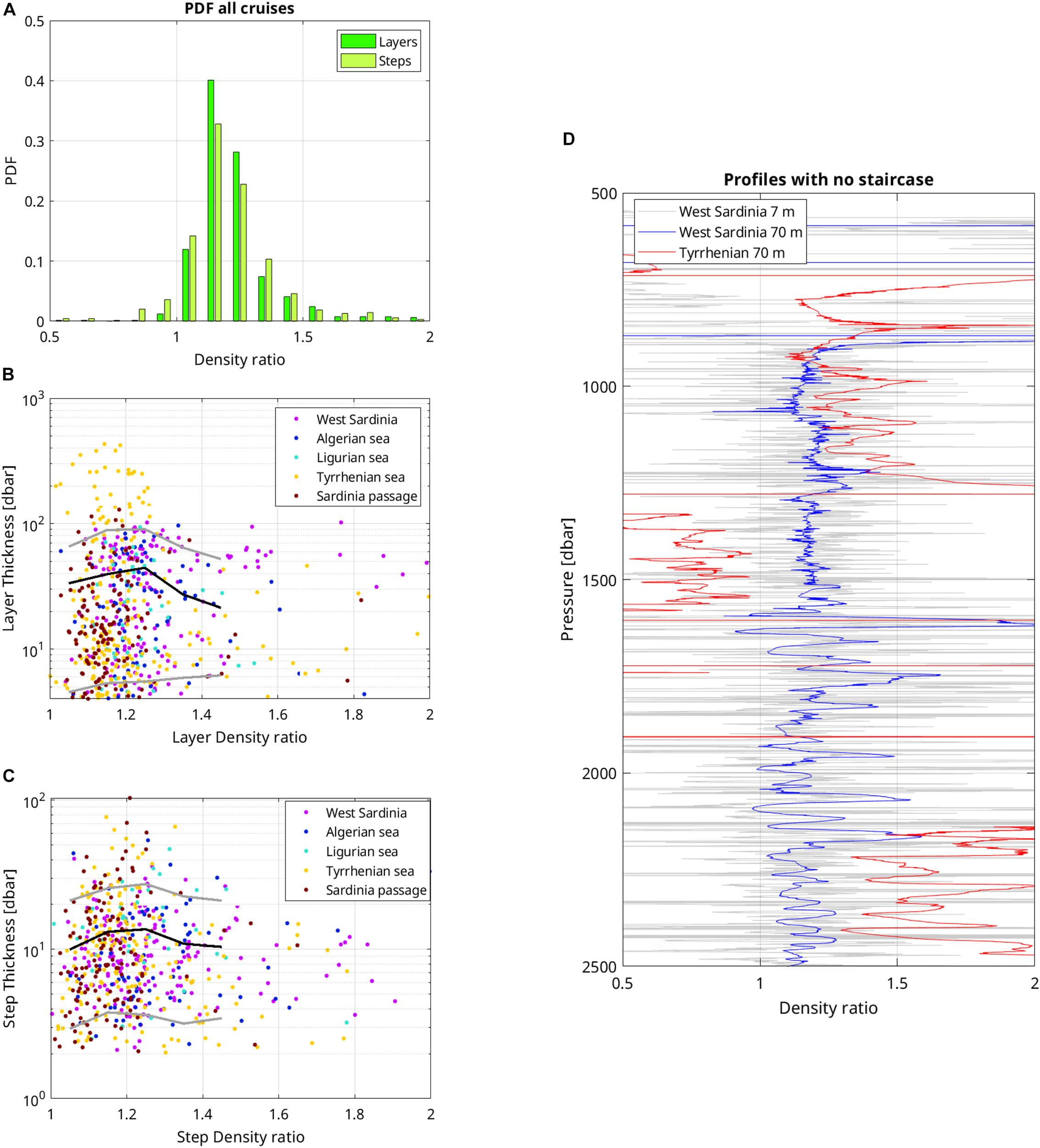 Consistently with observations made in 2006, 2008, and 2010 (B14), staircases were also found in the Algerian sea from 500 to 1300 dbars during the fall cruises of 2013 and 2014 (Figures 3D–F). In this region, 42% of layer thickness is smaller than 20 dbars and 11% is larger than 60 dbars.