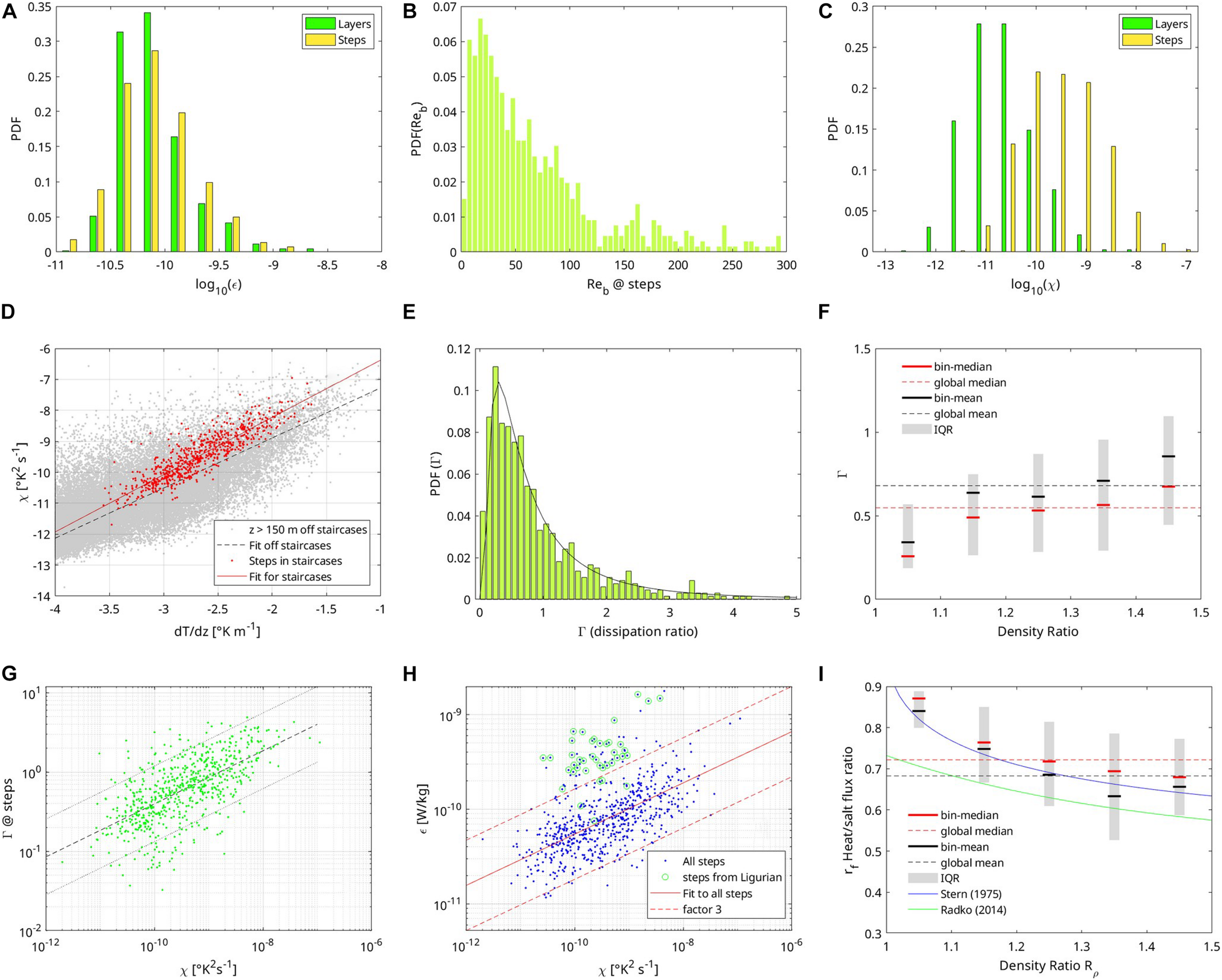 (A) PDF of kinetic energy dissipation rates ε (units W kg–1) for steps (yellow) and layers (green), (B) PDF of turbulence intensity Reb for steps, (C) PDF of temperature variance dissipation rates χ (°K2 s–1) for steps (yellow) and layers (green), (D) distribution of χ as a function of the vertical temperature gradient θz for regions without any staircase deeper than 150 m (gray dots with dashed black linear fit) and for the steps of staircases (red dots with dark red linear fit), (E) PDF of observed dissipation ratio Γ (bars) for steps with its lognormal fit (black line), (F) Γ per density ratio (Rρ) bin with the median (red line) and mean (black line) for each bin and the global median (red dashed) and mean (black dashed) for bins having at least 30 steps, the interquartile range (IQR, 50% of the data, gray bars) shows the scatter of the data per bin, (G) Γ vs. χ for steps (green dots) with a fit in the loglog phase space (black dashed) and a factor of 3 range from the fit (dotted lines), (H) ε vs. χ for steps (all steps: blue dots; Ligurian: green circles) with a fit in the loglog phase space (red solid line) and a factor of 3 range (red dotted lines), (I) same as (F) for the heat to salt buoyancy-flux ratio rf vs. Rρ, with the Stern (1975) relationship (blue line).