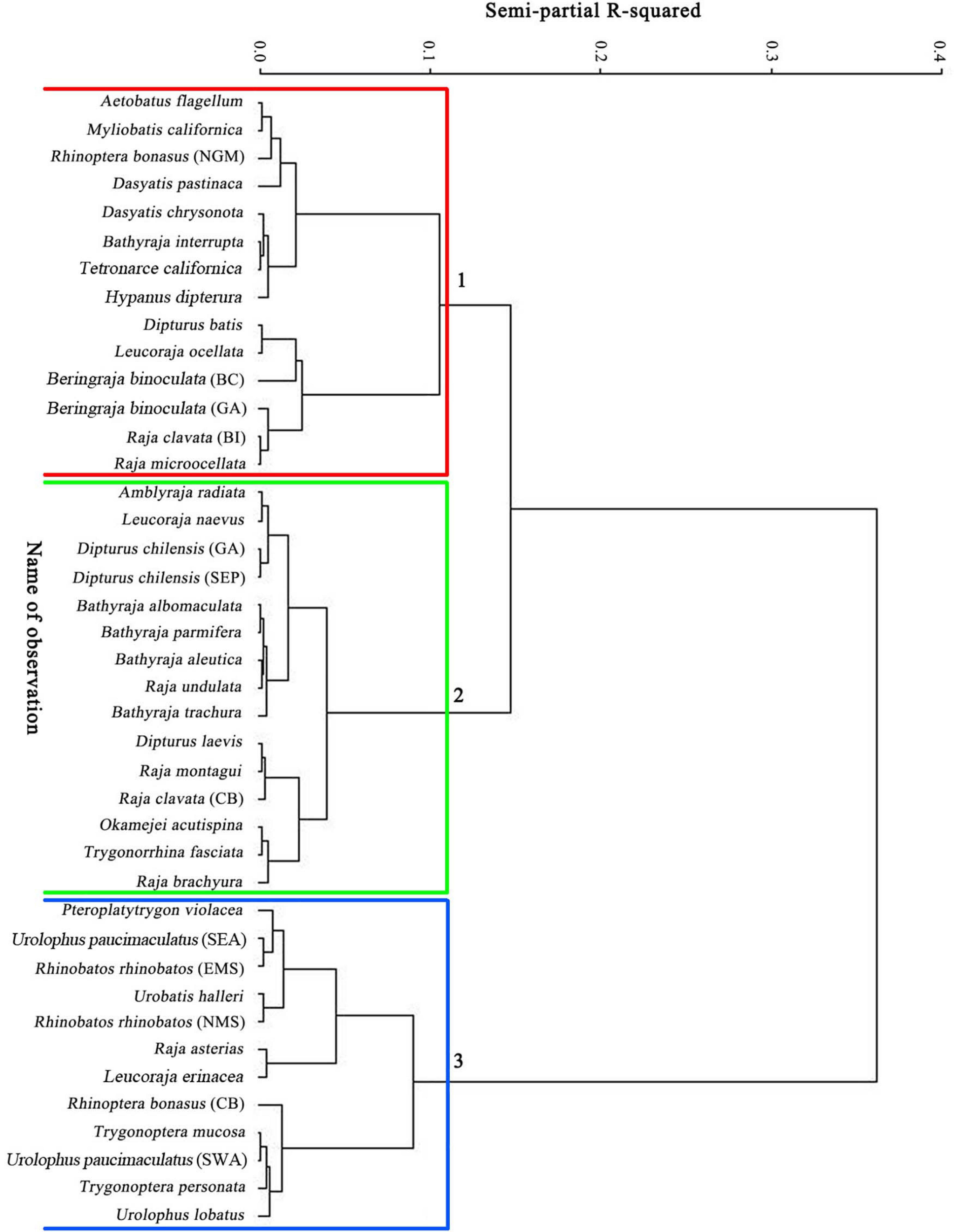 To examine the life history strategy associated with the habitat of skates and rays, habitat information including the water depth of habitat (Dep), sea surface temperature (SST), and salinity (Sal) were collected from the literature for the blue stingray Dasyatis chrysonota in the South Africa (Cowley, 1997; Ebert and Cowley, 2008), the diamond stingray Hypanus dipterura in the western Mexico (Mariano-Melendéz, 1997; Smith, 2005; Smith et al., 2007), the western shovelnose stingaree in the western Australia (White et al., 2002), the masked stingaree Trygonoptera personata in the western Australia (White et al., 2002), lobed stingaree Urobatis lobatus in the lower western coast of Australia (White et al., 2001), yellownose skate Dipturus chilensis (Fuentealba and Leible, 1990; Licandeo et al., 2006), and sharpspine skate in the northeastern waters off Taiwan (Chang, 2006; Joung et al., 2011). The habitat information for other species was adopted from the Fish Base (Froese and Pauly, 2015). The habitat information was treated as category variable, as follows: SST, (1) 0–10°C, (2) 10–20°C, and (3) > 20°C; depth, (1) < 50, (2) 50–200, and (3) > 200 m; salinity, (1) 30–33, (2) 33–36, and (3) > 36 psu (Supplementary Table 1).