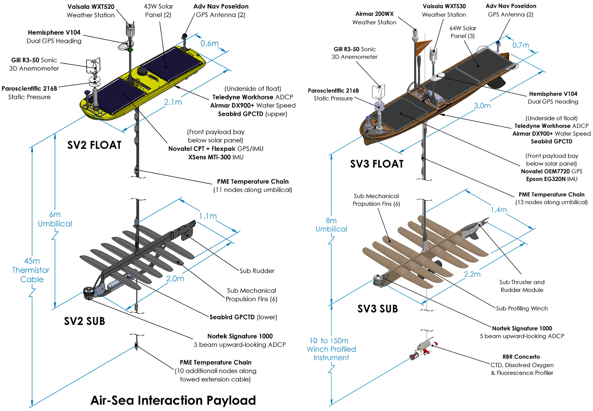 Perspective views of the Air-Sea Interaction Laboratory SV2 and SV3 Wave Gliders showing their respective instrument packages and their most relevant dimensions.