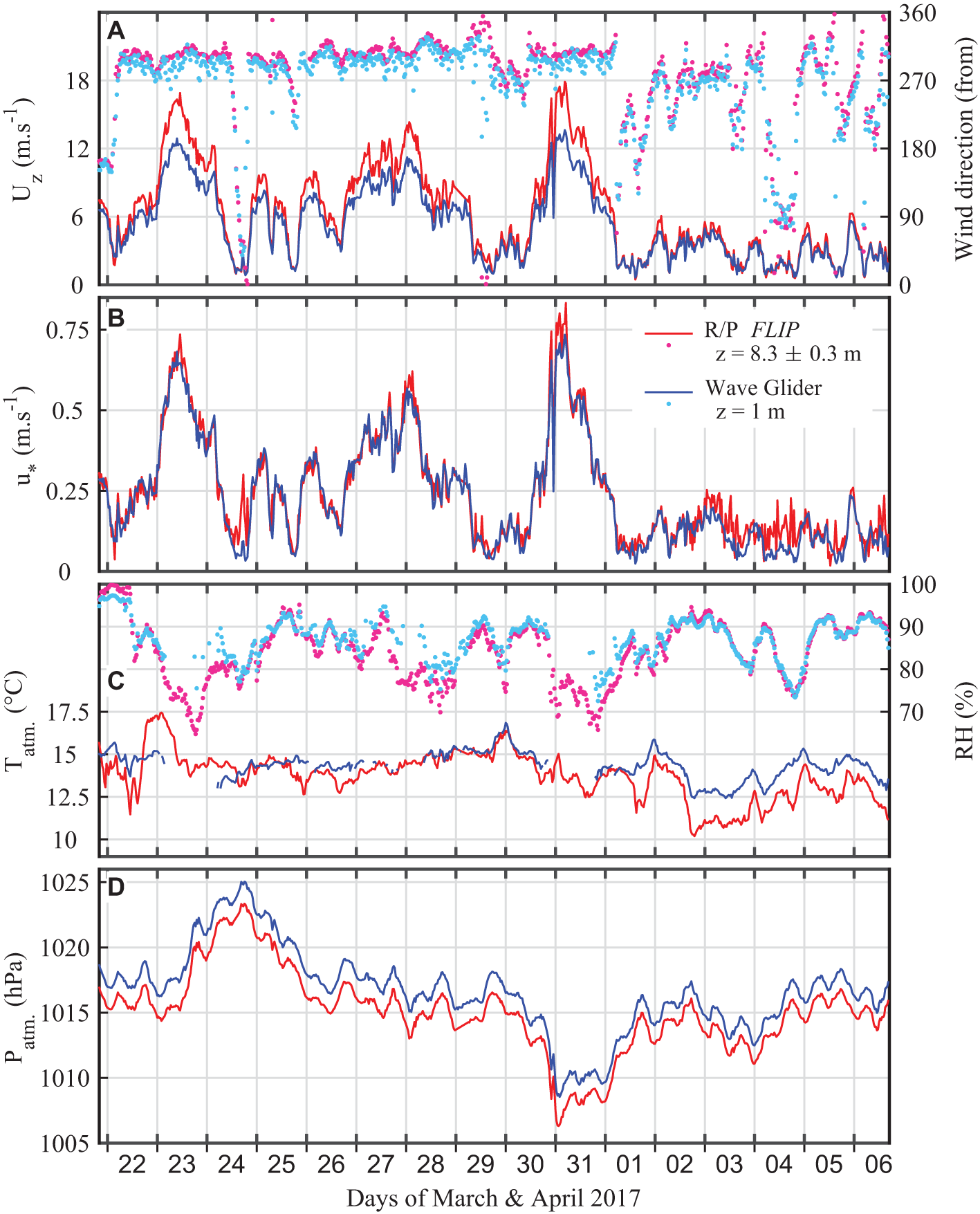 Figure 2 presents measurements of atmospheric variables observed by one of the SV2 Wave Gliders (shades of blue), colloquially named Kelvin, alongside measurements from the R/P FLIP (shades of red) during the LCDRI2017 campaign. For this data set, the Wave Glider was maintaining a rectangular pattern around R/P FLIP with a minimum, mean, and maximum separation of 180, 800, and 3,100 m, respectively. On the Wave Glider, all atmospheric measurements were collected from the Vaisala WXT520 weather station mounted 1 m above the sea surface. On the R/P FLIP, wind conditions were measured from a Gill R3-50 sonic anemometer, while atmospheric temperature and humidity were collected from a Campbell Scientific HC2S3 probe. Both instruments were located 8.3 ± 0.3 m above the mean sea level (MSL). Atmospheric pressure was sampled by a LICOR-7500 Open Path CO2/H2O Analyzer mounted 14.0 ± 0.3 m above the MSL. All instruments on the R/P FLIP were mounted on a vertical mast that was secured to the end of the portside boom of the R/P FLIP. For both platforms, wind measurements were corrected to account for the motion of the platform.