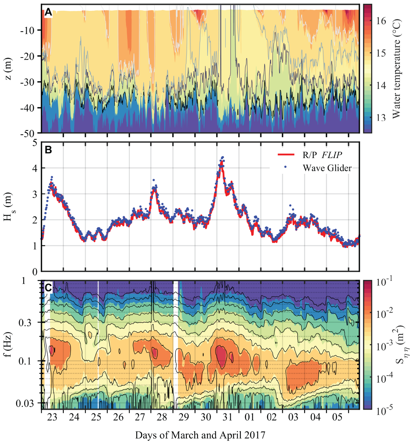 (A) Time evolution of the water temperature during the LCDRI2017 experiment measured by the thermistor chains mounted on the SV2 Wave Glider Kelvin and on the R/P FLIP. Colormap and contour lines correspond to data from the R/P FLIP and from the SV2 Kelvin, respectively. The white contour line corresponds to 15.2°C, light gray is 14.8°C, dark gray is 14.65°C, and black is 14.0°C. Direct comparison of 20 min averaged water temperature between the two instruments gives a coefficient of determination r2 = 0.8 ± 0.03. (B) Significant wave height Hs and (C) omni-directional spectrogram of the wave field measured from the R/P FLIP and the SV2 Wave Glider Kelvin during LCDRI2017. In (C), the colored map and black contours are from the R/P FLIP and the Wave Glider, respectively. The significant wave height Hs is computed from the integration of the omni-directional spectrum, both being computed over 30 min long records. For the R/P FLIP, Sηη is computed from a single laser wave gauge, while for the Wave Glider, the surface elevation is assumed to be described by the vertical displacement (heave motion) of the Wave Glider. The coefficient of determination r2 for Hs is equal to 0.95.