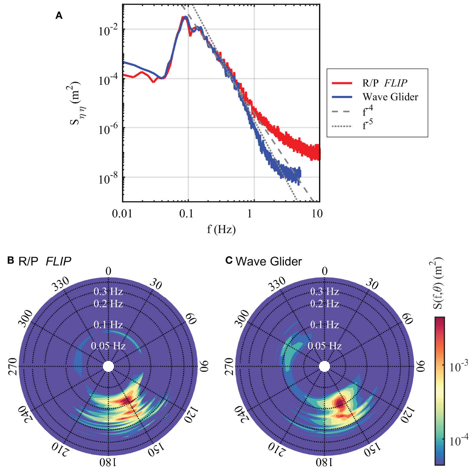 (A) Comparison of the omni-directional wave spectra measured from the R/P FLIP (red) and the SV2 Wave Glider Kelvin (blue) from the 30 min record starting at 2300 UTC 31 March 2017 during LCDRI2017 while the wind was blowing at 8.1 m s−1. For the R/P FLIP, Sηη is computed from the surface displacement measured by a single laser wave gauge, while for the Wave Glider, the surface elevation is assumed to be described by the vertical displacement (heave motion) of the Wave Glider. There is good agreement between the two platforms in the frequency range [0.04, 0.6] Hz. (B,C) Comparison of surface wave directional spectra measured from the R/P FLIP and the SV2 Wave Glider Kelvin during the same 30 min record as in (A). For the R/P FLIP, the directional spectrum was derived from the array of single point laser wave gauges mounted on each of the R/P FLIP booms. For the Wave Glider, the directional spectrum was derived from the three components of the Wave Glider velocity. Both directional spectra are computed using the WAFO toolbox. Frequency increases radially outward following a logarithmic scale from the center of each plot, with the color scale depicted as the log of the energy density.