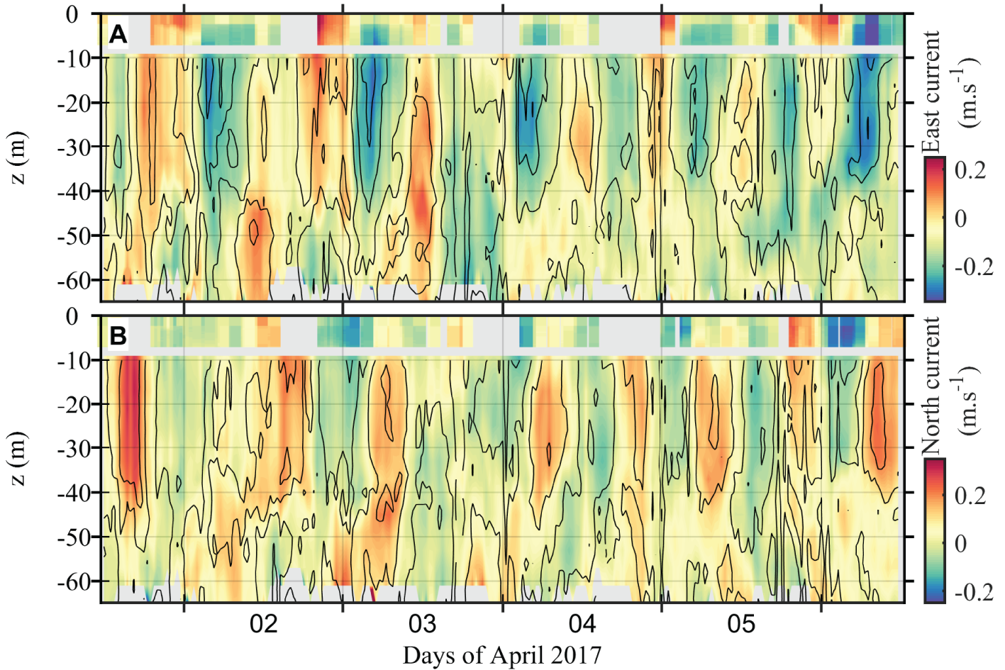 In Figure 5, 30 min averaged profiles of east (top) and north (bottom) components of the current measured during the LCDRI2017 experiment from the SV2 Wave Glider Kelvin (colored background plot) and the R/V Sally Ride (black contours) for a 5-day period starting on 1200 UTC 01 April 2017 are shown.