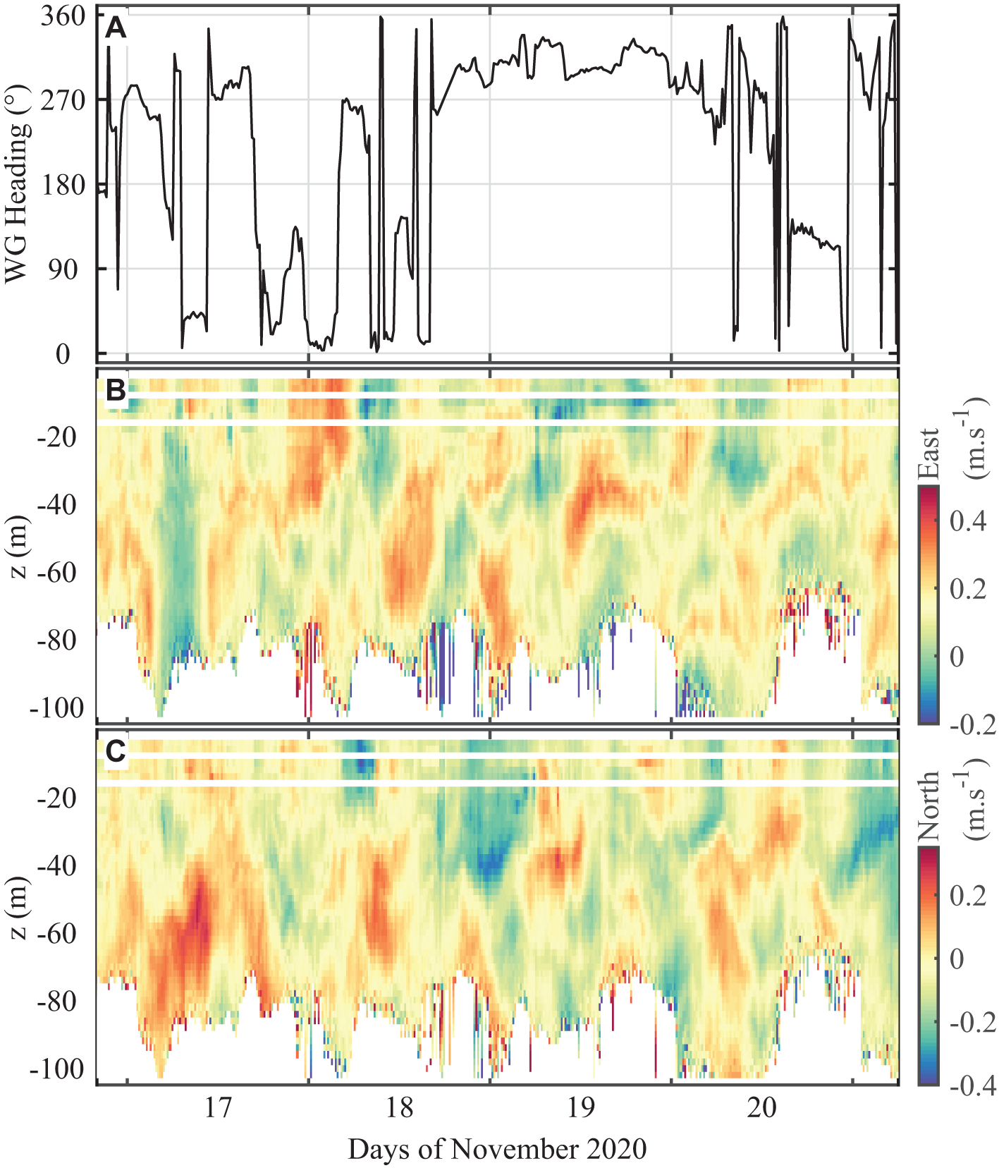 (A) Heading angle of the platform, (B) east current, and (C) north current components measured by the SV3 Wave Glider Planck during the TFOex2020 experiment. The measurements at 8 and 16 m were discarded because they were contaminated by side-lobe reflection due to the sub fins. Current measurements were performed by a 300 kHz downward-looking ADCP. These current profiles are the motion-compensated, averaged products computed in real-time by the payload and sent back to shore via Iridium satellite communications every 15 min. Each individual 1 s ADCP ping is corrected for the velocity of the platform and, subsequently, the current profiles do not exhibit any correlations with the heading of the Wave Glider that had been observed previously when motion compensation was executed after averaging over longer duration, multiple ping ensembles.