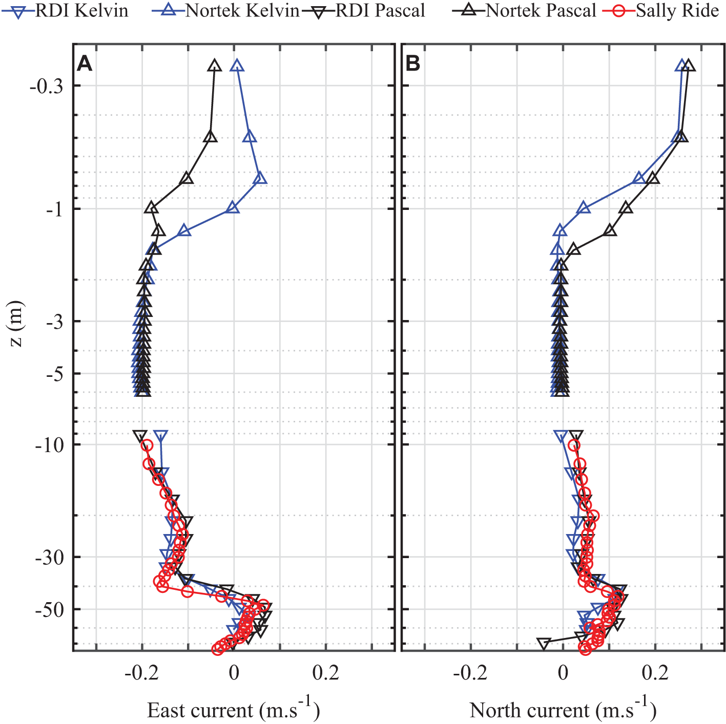 Figure 7 shows a comparison of the 30 min averaged profiles of east (left panel) and north (right panel) components of the ocean current collected during the LCDRI2017 experiment starting at 0900 UTC 02 April 2017. Profiles from the two SV2 Wave Gliders, Kelvin in blue and Pascal in black, are presented along with observations from the R/V Sally Ride data in red. During this 30 min record, the R/V Sally Ride remained approximately idle, with an average speed of <2 cm s−1 while maintaining a constant heading. We find good agreement between observations from the three different platforms below 10 m, the minimum depth that is reasonably achievable from the ship-mounted ADCP. The plots also highlight the change in current profiles across the mixed layer depth. At the top of the ocean boundary layer (OBL), we find continuity of the current profiles from the downward- to the upward-looking ADCPs for both Wave Gliders. Discrepancies between the two Wave Gliders found in the near-surface current observations are caused by spatial variability, as the Wave Gliders were separated by 1.5 km at that particular time. Note that the ability to collect current profiles close to the surface is crucial to relate orbital and suborbital remote sensing velocity products to the more traditional in-situ measurements that usually only provide valid observations at depths larger than a few meters. Figure 7 shows that these instrumented Wave Gliders are well suited to bridge that gap.