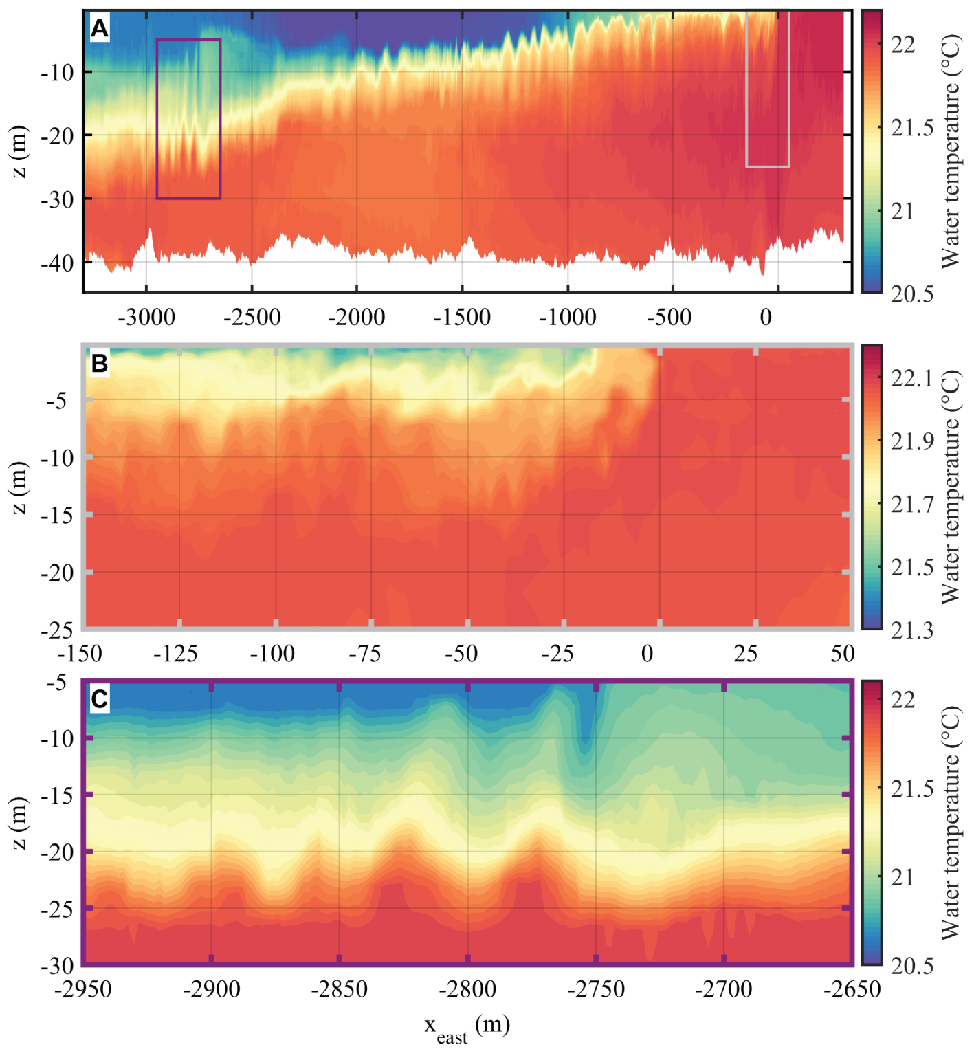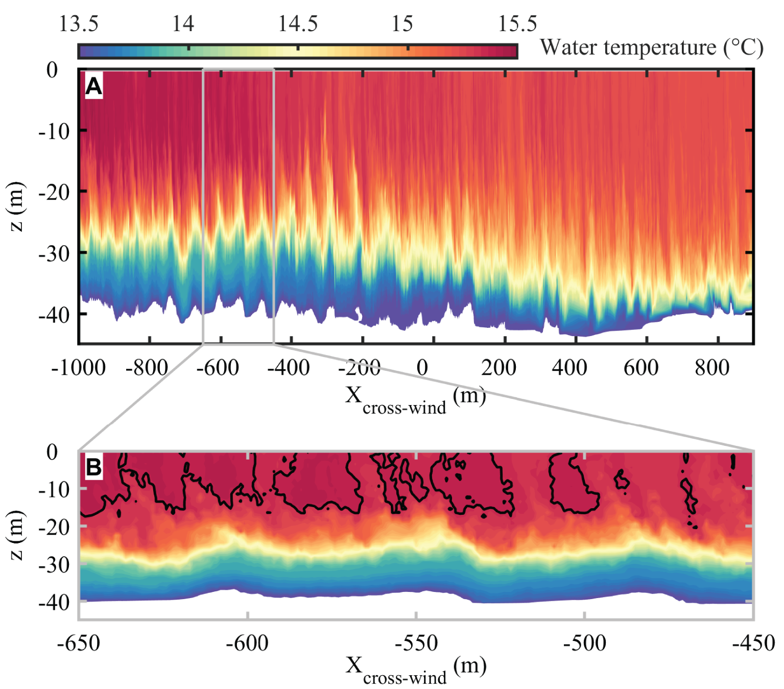 A comparison of the water temperature over the first 50 m of the ocean boundary layer measured by the respective T-Chains that were mounted on both the SV2 Wave Glider Kelvin and on the R/P FLIP during the LCDRI2017 campaign is shown in Figure 3A. The colored timeline corresponds to data collected from the R/P FLIP while the white (15.2°), light gray (14.8°), dark gray (14.65°), and black (14°) contour lines correspond to the Wave Glider measurements. Data are averaged over 20 min long records. As described earlier, the Wave Glider T-Chain is split into two sections, with the shorter upper portion located between the float and the sub, attached to the Wave Glider umbilical, and the longer lower portion towed below the sub using a weighted downrigger mounted to the deep end to maintain a vertical orientation of the T-Chain. The top section is composed of 11 temperature nodes, while the bottom section is equipped with 10 thermistors plus two pressure sensors to compute the actual depth at each node. The temperature sensors are spaced logarithmically near the surface and linearly at increasing depth such that their distances from the surface are 0.34, 0.60, 0.81, 1.00, 1.51, 2.00, 2.50, 3.24, 3.99, 4.73, and 5.73 m for the upper portion, and 7.48, 11.48, 15.48, 19.48, 23.48, 27.48, 31.48, 35.48, 39.48, and 43.48 m for the lower portion, while the integrated pressure nodes are located at 24.48 and 45.48 m below the surface. The depth of the sub is derived using data from the GPCTD that is mounted on the sub. When the Wave Glider is underway, the drag that is induced by the water friction, which depends on both the Wave Glider speed and the oceanic current, modifies the depth of each temperature node. The actual depth of each thermistor is calculated through linear interpolation using the depth of two consecutive pressure sensors. On the R/P FLIP, the T-Chain is composed of 17 temperature sensors, again logarithmically spaced close to the surface, extending down to 51 m water depth. The T-Chain is lowered from the end of one of the R/P FLIP's booms and heavily weighted at its deep end to keep the chain as vertical as possible. The depth of the reference bottom pressure sensor varied by less than half a meter during the deployment, so we therefore assume that the 17 nodes of the R/P FLIP T-Chain remained at a constant depth during the experiment. Data sets from the two T-Chains were interpolated onto a fixed vertical grid and compared with each other over the course of LCDRI2017 in Figure 3A. Good agreement between measurements from the two platforms is observed with a coefficient of determination equal to 0.82 and a root mean square error of 0.27°C. Note that some of these differences can be in part explained by the fact that the measurements and reference frames of the Wave Glider and the R/P FLIP are not identical. On the Wave Glider, the measurements are performed in a wave-following frame, ideal for measurements close to the surface, with the temperature sensors remaining at a constant distance from the oscillating surface. However, at greater depths where the vertical displacement of the water column is minimal, the nodes of the T-Chain experience a wave-coherent motion as the sub moves up and down under the action of the waves above. This motion is responsible for a pseudo-profiling of the water column around the mean depth of the T-Chain nodes. On the other hand, the R/P FLIP T-Chain is fixed with minimal vertical motion. This impacts the measurement quality close to the surface as upper nodes can end up completely out of the water in the trough of large waves, but with the benefit of uncontaminated measurements in the absence of T-Chain motions at larger depths.