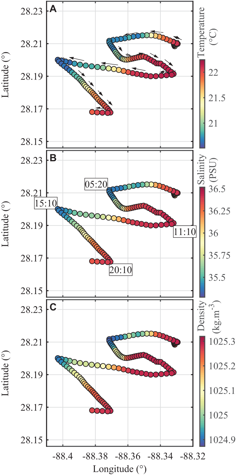 The R/V Sally Ride was equipped with a downward-looking Teledyne WorkHorse 300 kHz ADCP mounted on the hull, 4 m below the waterline. The ADCP was set to record 120 s ensembles made of 150 pings, measuring currents at 50 depths, every 2 m from about 10–108 m depth. Each ensemble (averaged over the 150 pings) was corrected for the motion and orientation of the ship and expressed in an earth frame coordinate system using 120 s averaged attitude and position products from the onboard R/V Sally Ride gyroscope and GPS sensors.