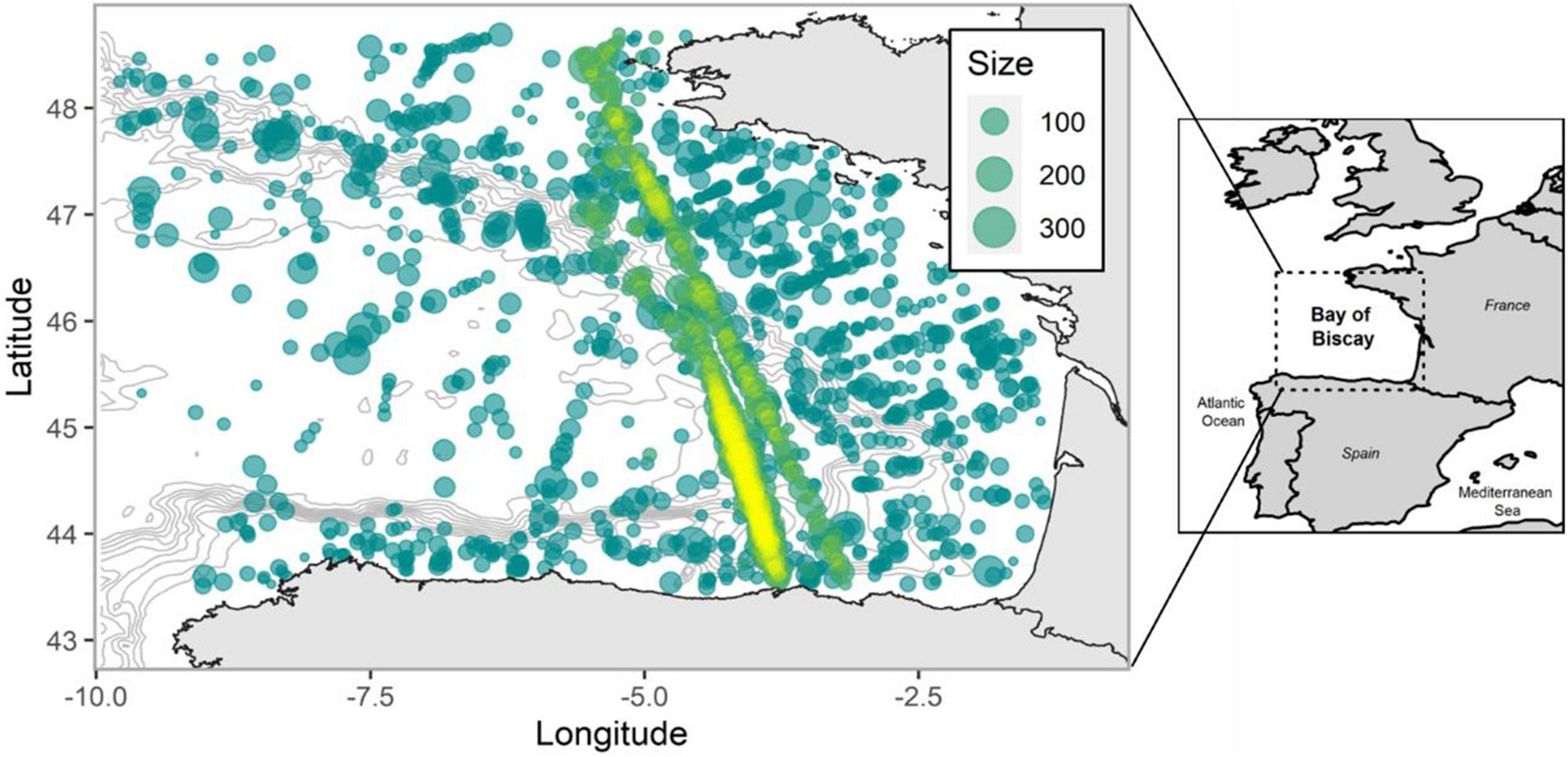 Until now, this estimator has been mainly applied to commercially important fish stocks (Godefroid et al., 2019; Perretti and Thorson, 2019; Xu et al., 2019), although the fragmented and methodologically variable nature of marine mammal observations suggest the method could be highly useful for analyzing the spatio-temporal patterns of marine megafauna too. Within that context, the Bay of Biscay (BoB hereafter), located in the Northeast Atlantic, off the coasts of France and Spain (Figure 1), represents an interesting study area since numerous marine mammal species (e.g., cetaceans) cohabit there, attracted by a highly diverse and abundant community of pelagic fish species (Astarloa et al., 2019; Louzao et al., 2019).