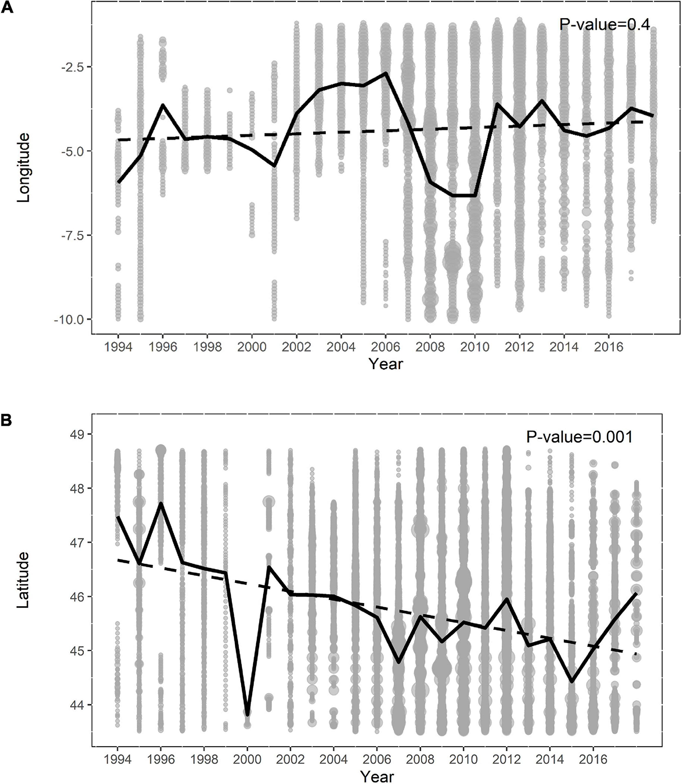 Sampling effort (number of segments of up to 10 km) as a function of year and longitude (A), and year and latitude (B). In both figures the size of the circle is proportional to the sampling effort; the black line indicates the mean value and the dotted line the linear temporal trend.