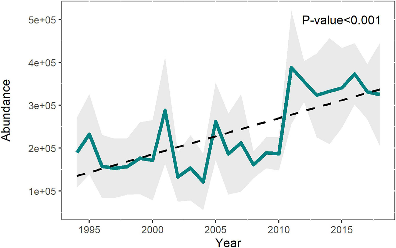 Abundance of common dolphin in the BoB predicted by the baseline spatio-temporal model with standard deviation (shaded area), the linear trend, and its significance.