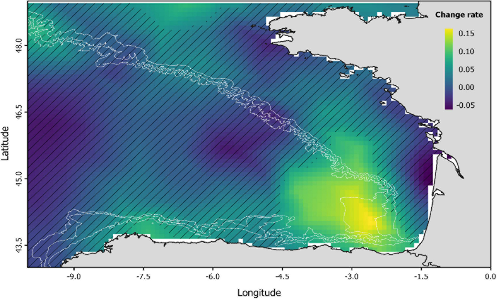 Spatio-temporal changes in the abundance of common dolphin (predicted by the baseline model) illustrated by means of the change rate (the slope of the linear regression). Hatched areas indicate those areas where change rate is not significant (p > 0.05).