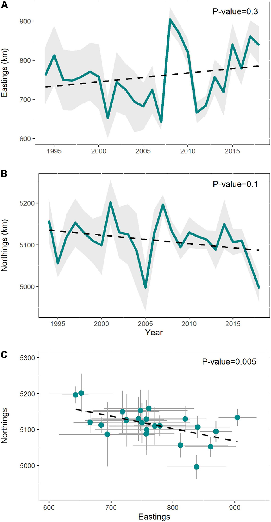 The variation in the center of gravity (CoG) of common dolphin expressed in eastings (A) and northings axes (B), and as a function of both (C). Shaded area means the standard error, while the dashed line indicates the linear trend.