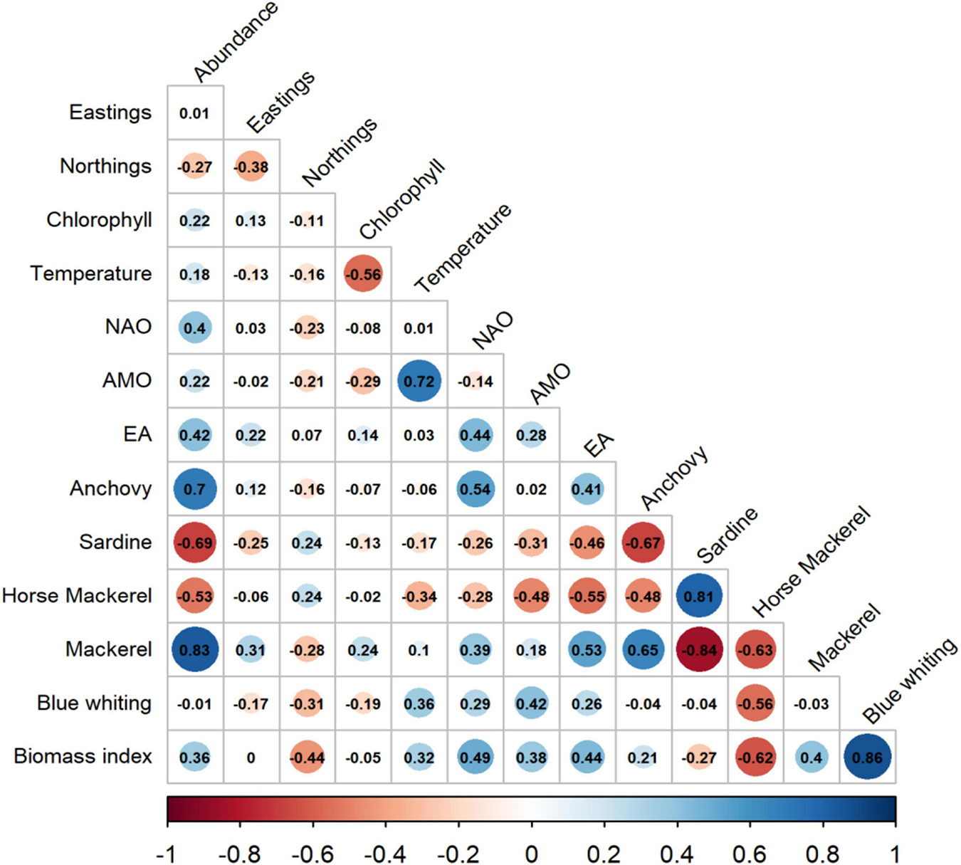 The correlation between the potential drivers and the CoG (easting and northings) of common dolphin only showed weak relationships. In contrast, predicted abundance revealed several strong relationships (r > 0.5) with prey species, specifically mackerel and anchovy (positive correlation), and sardine and horse mackerel (negative correlation) (Figure 6). After prey species, only EA and NAO climate indices showed a moderate correlation with abundance (r∼0.40). Blue whiting was not significant (p > 0.05), while temperature, Chl-a, AMO and the prey biomass index showed weak relationships (r∼0.20) (Figure 6).