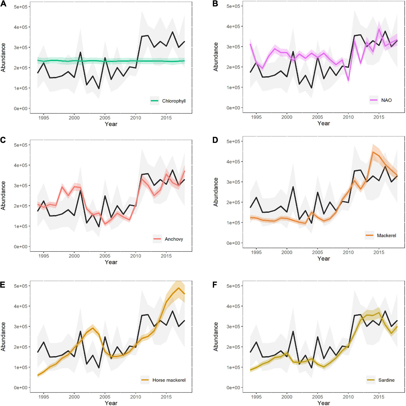 For covariates-based models, the AIC score showed that the most substantial decrease was for the NAO index and regional prey species biomasses (especially anchovy and sardine). Local Chl-a concentration, as well as horse mackerel and mackerel, only contributed slightly, while remaining drivers (temperature, AMO, EA, blue whiting and prey species biomass index) were not relevant in terms of AIC (Table 2). Functional relationships of those important drivers revealed positive responses for NAO, anchovy, mackerel and negative for Chl-a, horse mackerel and sardine (Supplementary Figure 9).