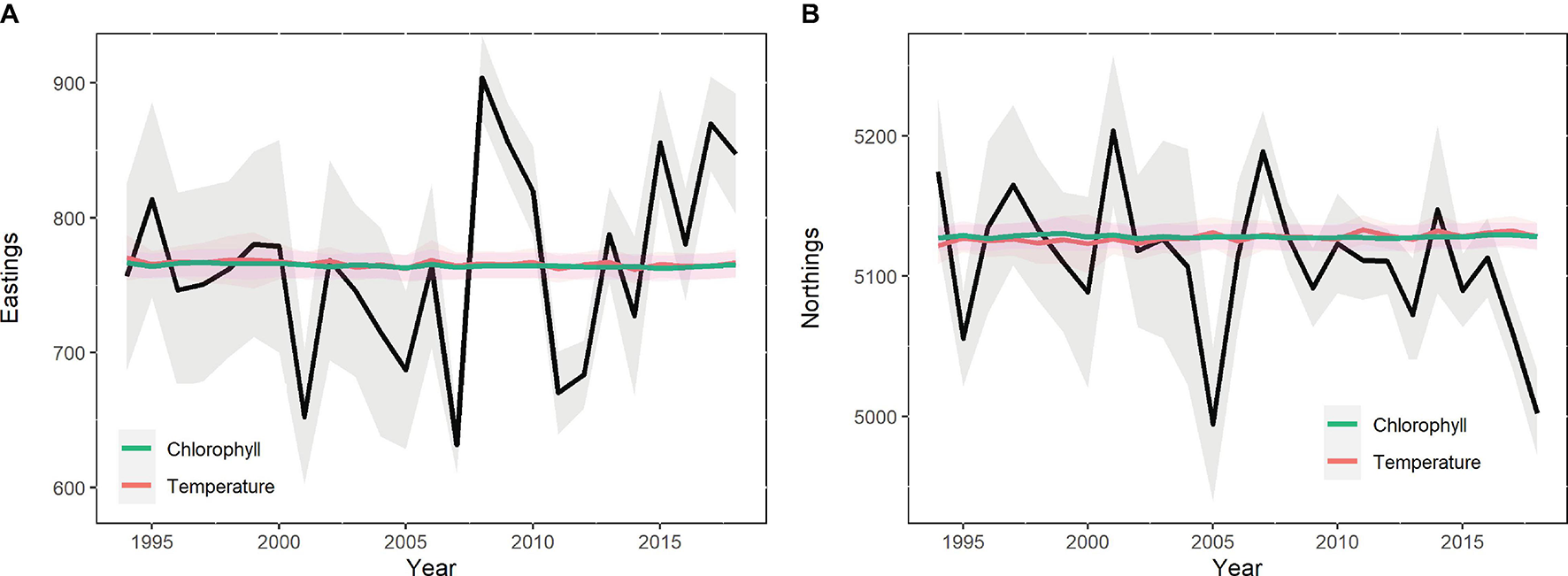 Shifts in distribution were summarized by calculating the centroid of the distribution for a given year (termed center of gravity, CoG) after having predicted the density associated with every knot and year in the previous step. By means of the SDF estimator implemented in the VAST model, the CoG was calculated for the BoB population domain and standardized by the total abundance predicted for the study area, so that our analysis focused on changes in distribution after controlling for changes in total abundance (Thorson et al., 2016). Shifts in CoG were displayed in terms of “Eastings” and “Northings,” meaning km from the most western point of the study area and km from the Equator, respectively. Significant trends were identified using a linear regression against year.