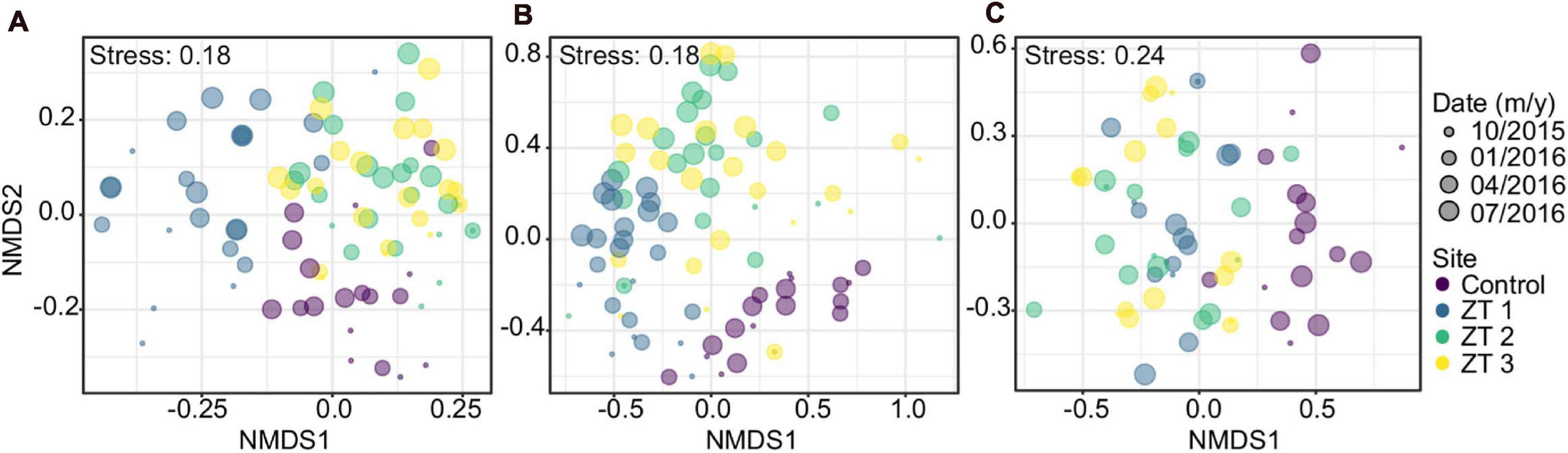 In order to know the fit and confirm the model assumptions were not violated, analysis graphs were obtained for model residuals. In other work conducted on coral reefs, biomass has been properly modeled from negative binomial GLM, thus capturing over-dispersion present in the biomass data (Ferrari et al., 2018). The ordination was visualized from a non-metric multidimensional scaling, based on the Bray-Curtis dissimilarity matrices, using data transformed to the logarithm. This analysis was made from program R’s “vegan” library. These analyses were conducted for all data transects within each site and on each of the dates sampled.