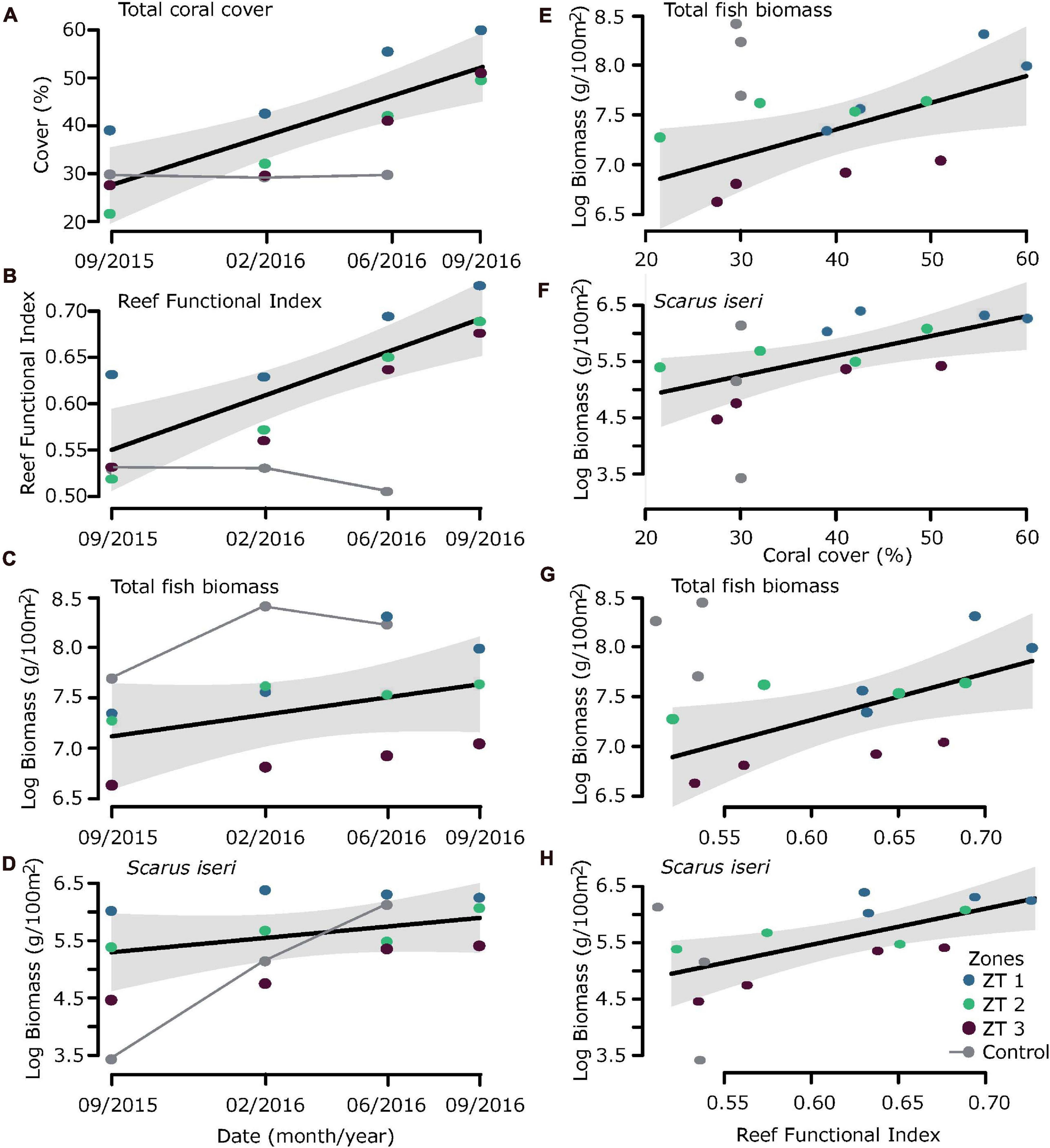 Regression models were performed to explain changes in cover, RFI, Total fish biomass and Scarus iseri biomass as a function of time (as an indicator of effort from outplanting actions), as well as models explaining changes in total fish biomass and significant fish species in the multi-dimensional GLM as a function of coral cover percentage and change in RFI (as a measure of structural complexity and proxy indicator of coral cover). Linear regression models, based on median data for sampling site and date, were chosen for this analysis using the untransformed data for coral cover and RFI, as well as a log transformation for fish biomass. Graphical residual assessments and a global test of linear models were carried out to verify the regression models’ assumptions (Pena and Slate, 2006). Regression curves of the prediction lines and 95% Wald confidence bands were plotted using the “visreg” package of the R program (Breheny and Burchett, 2017).