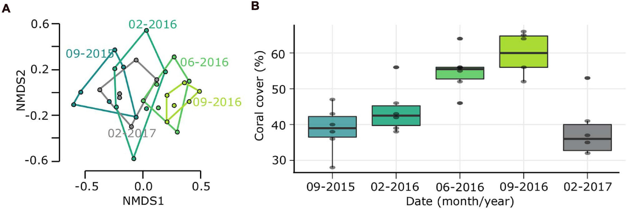 In the three outplanting and control sites, 29 species of coral and 41 species of fishes were observed (Table 2). The Scaridae family presented highest abundances, followed by the Acanthuridae family. During the 12 months of study, changes in benthic coverage (Supplementary Table 1), relative coverage of coral species (Supplementary Table 2), and relative biomass of fish species (Supplementary Table 3) were observed across sites, dates, and site-date interactions.