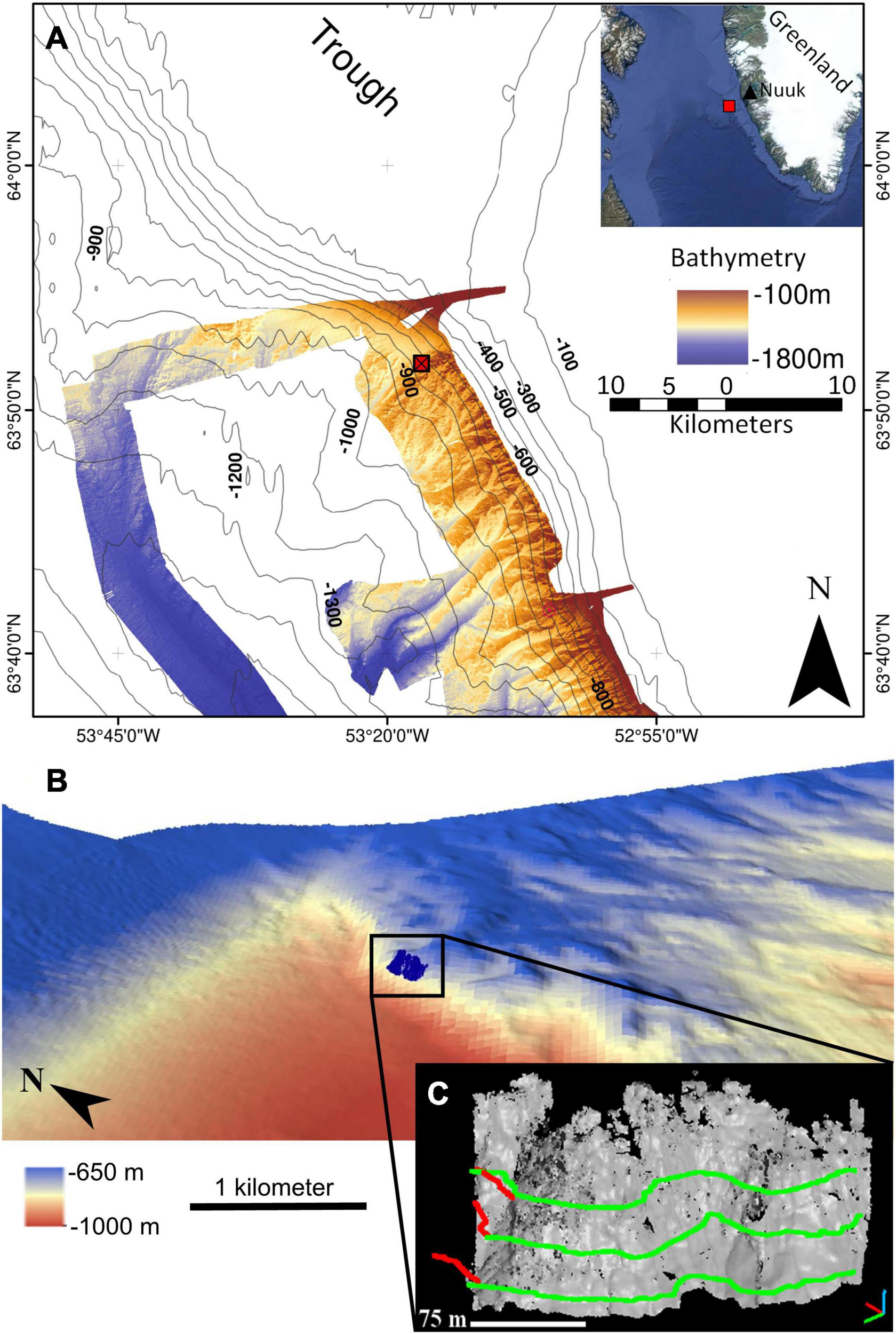 (A) Location map of the study site on the W Greenland continental margin. The red boxes indicate the position of the underwater wall (63°51.9′N, 53°16.9′W) in the Labrador Sea, where the dives D333 and D334 of the ROV Isis took place. The bathymetry displayed was acquired on board the RRS Discovery (DY081; Hendry, 2017; Hoy et al., 2018). The background bathymetry (contour lines) was retrieved from ETOPO (NOAA). The wall marks the boundary between a cross-shelf glacial trough and the Greenland continental shelf. (B) 3D repositioning of the deep-sea wall according to the shipboard bathymetry (DY081; Hendry, 2017; Hoy et al., 2018). Panel (B) was computed on ArcScene (v. 10.8.1). (C) The underwater wall with segments representing the ROV tracks carried out at depths of 740, 765, and 790 m with a multibeam echosounder (MBES) front-mounted on the underwater vehicle Isis. The ROV was piloted 25 m off the vertical terrain with headings of: 137° (green lines) and 214° (red lines).