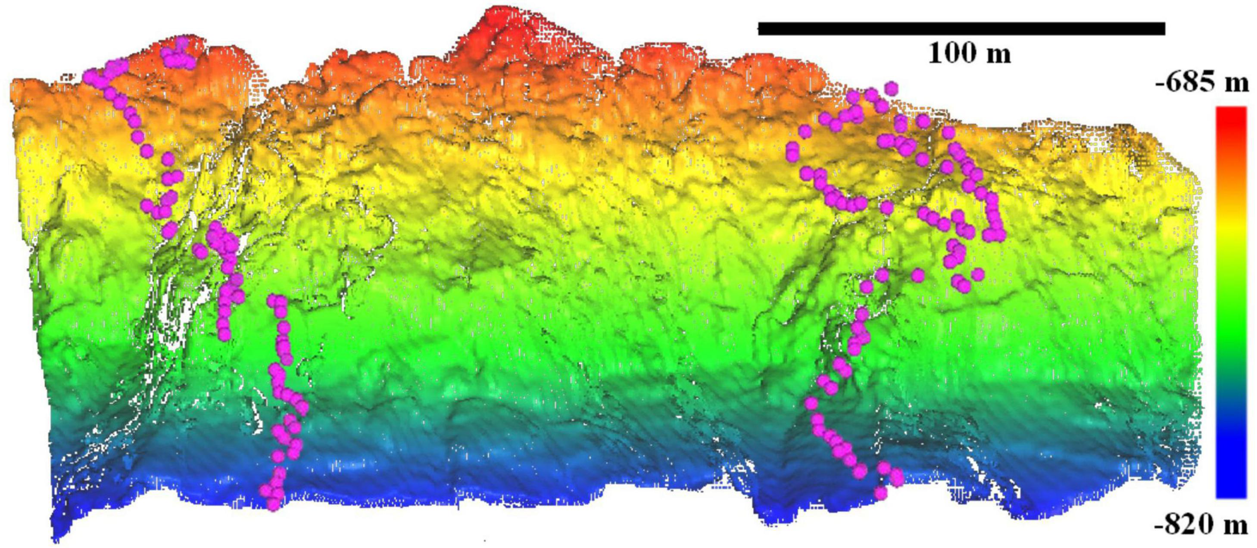 Front view of the high-resolution (0.3 m) terrain point cloud of the underwater wall marking the boundary between a trough and the West Greenland continental shelf (63°51.9′N, 53°16.9′W). The depth ranges from –685 to –820 m and is displayed as a color gradient. The deep-sea cliff terrain was mapped using a forward-looking MBES mounted onto the ROV Isis (Dive D334) and is displayed as a point cloud using the software CloudCompare. Pink dots locate the position of the ROV when taking seabed groundtruthing pictures (Dive D333) used to assess for assemblage differences among abiotic clusters.