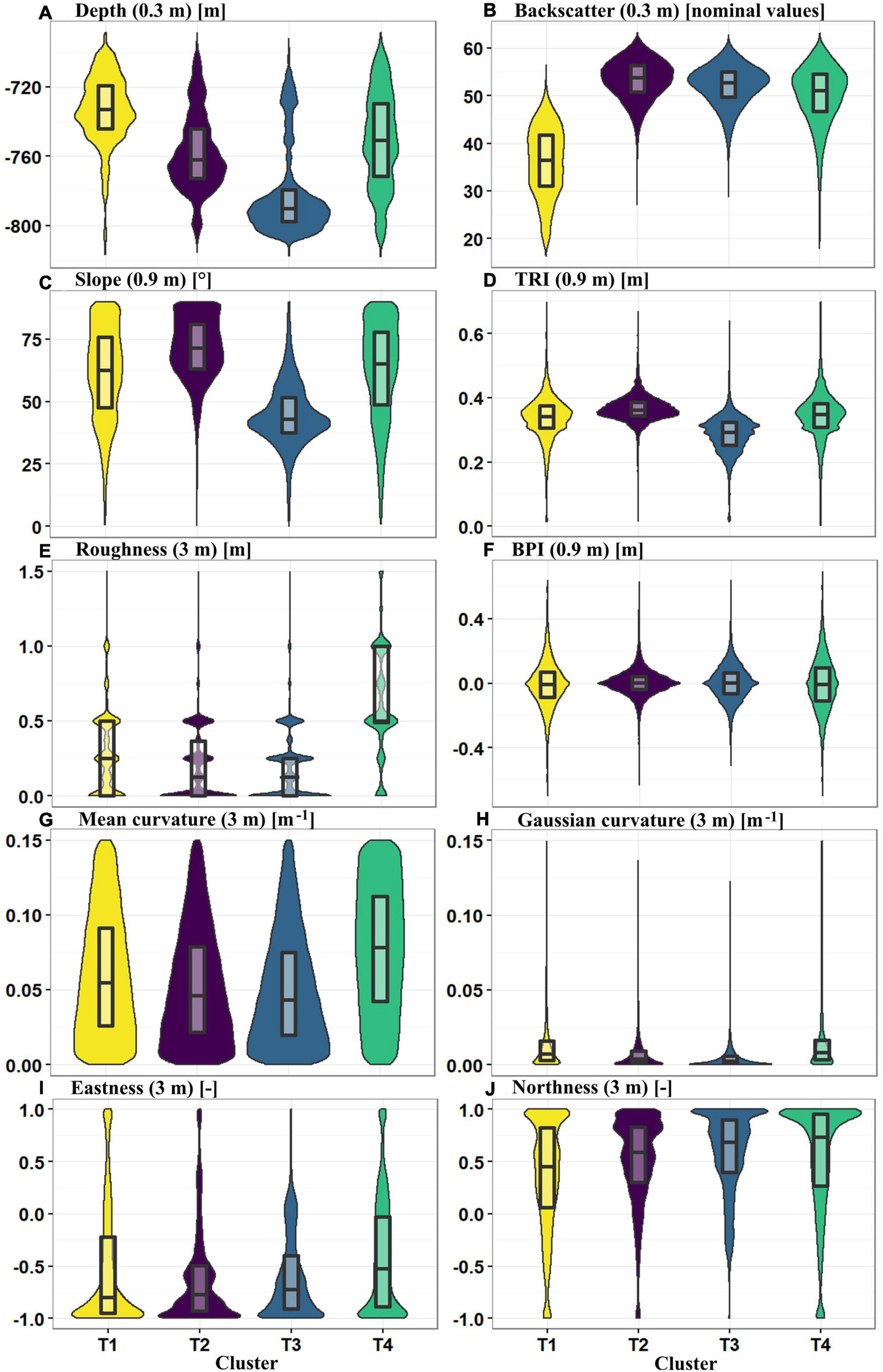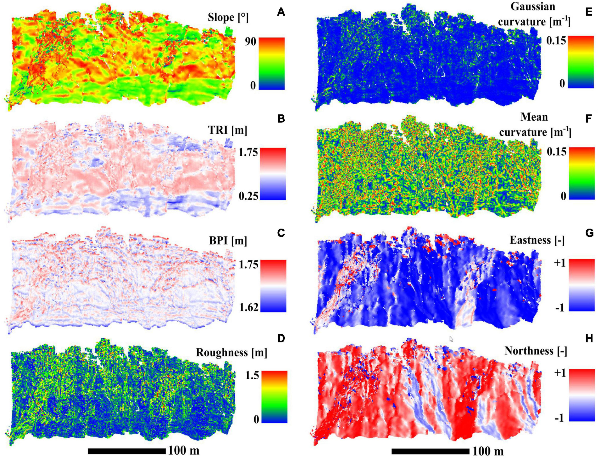 Spatial distribution of terrain derivatives at the finest scale of calculation: (A) Slope (0.9 m), (B) Terrain Ruggedness Index (0.9 m), (C) Bathymetric Position Index (0.9 m), (D) Roughness (3 m), (E) Gaussian curvature (3 m), (F) Mean curvature (3 m), (G) Eastness (3 m), (H) Northness (3 m).