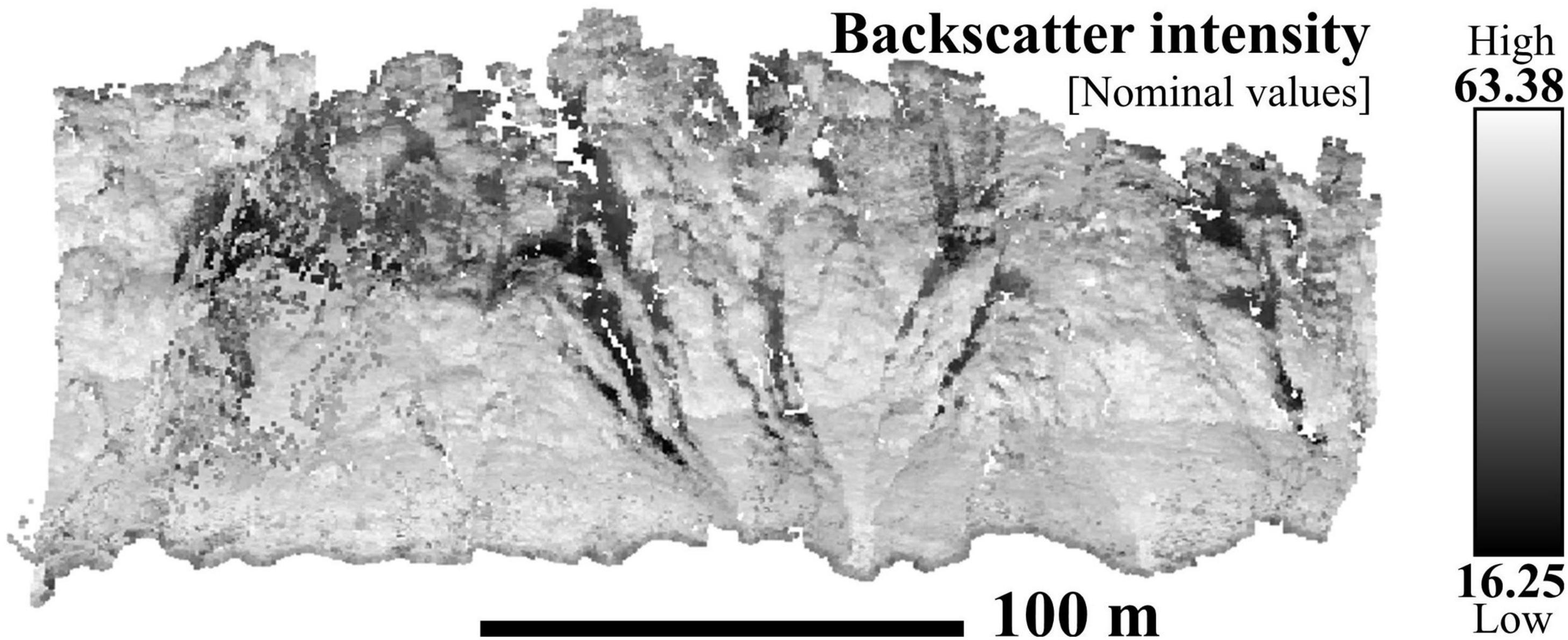 Other artifacts arose when calculating terrain derivatives such as the slope (Figure 3A) and the mean curvature (Figure 3F) in the form of sections of the cliff displaying highly heterogeneous values. We inferred two different causes for these issues. Firstly, the merging of the two point clouds was not perfect as small-scale offsets (∼m) in the reconstructed point clouds remained. This resulted in higher spatial variability of the terrain derivatives along the section where the two point clouds overlapped. Secondly, many sections exhibiting high local variability in the terrain descriptor values coincided with areas with high eastness (Figure 3G) and low northness (Figure 3H) but also with low point density (Supplementary Figure 4). Therefore, we hypothesize these artifacts to be related to the orientation of the cliff: as the ROV kept a constant heading during survey lines, sections of the cliff that were not locally facing the sonar swath were more overlooked as fewer beams were scanning these areas. This explains a locally poorer resolution of the point cloud, which makes it more sensitive to variability in the data when calculating the terrain descriptors with a given Kernel radius size. Similarly, low backscatter intensity (Figure 4) also locally corresponded with low-density areas, and may be caused by the local orientation of the cliff away from the sonar (Supplementary Figure 4).