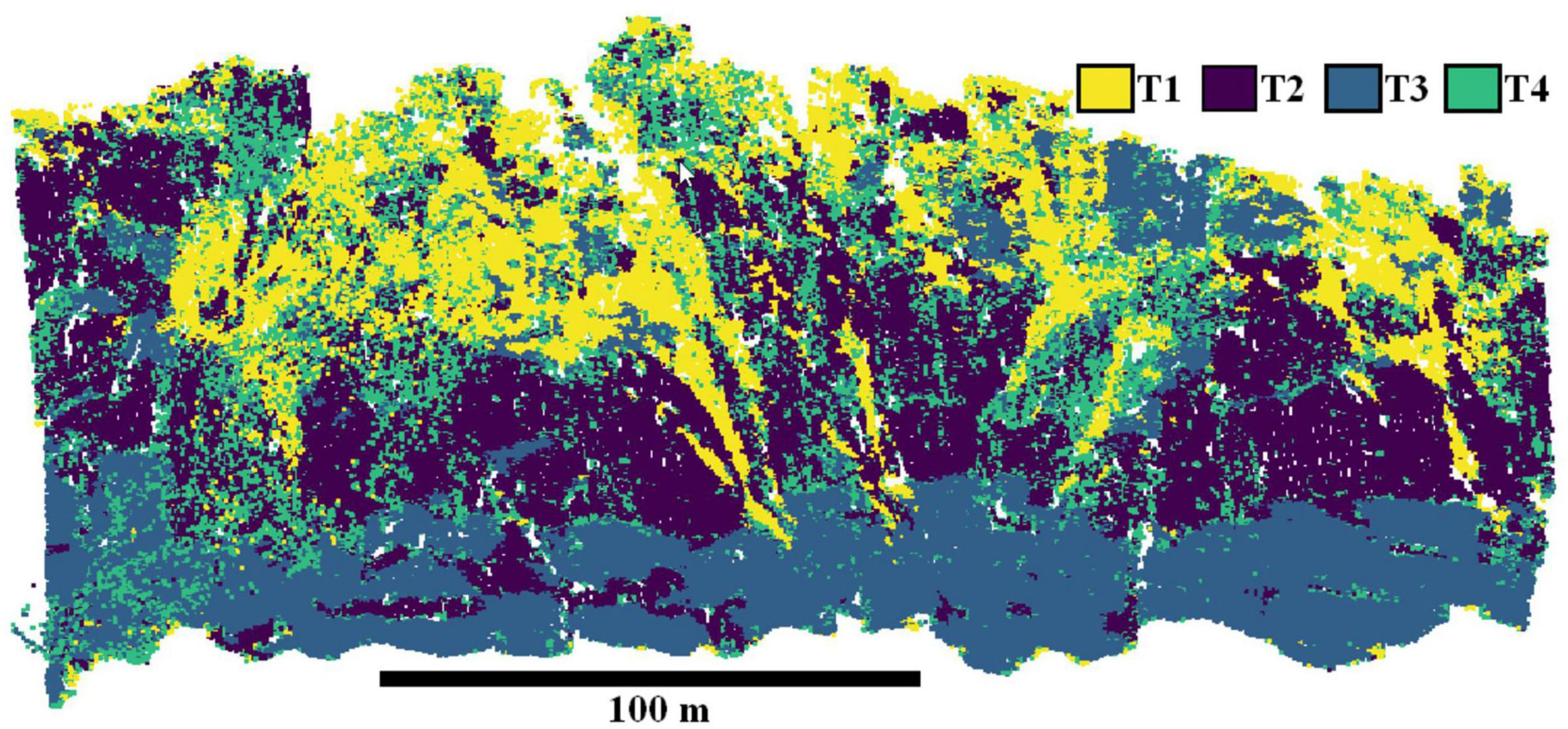 The high-resolution point cloud (0.3 m average resolution, 292,577 points; Figure 2) characterized the morphology of the wall. The average topography of the point cloud displayed a slope of 60° (±SD, 18°) oriented north, extending from a depth of 820 to 685 m. The area mapped was ca. 276 m wide with a planar area of 35,880 m2. Groundtruthing pictures are positioned in the terrain point cloud in Supplementary Figure 3 to visualize coinciding fine-scale features and different terrain habitat types.