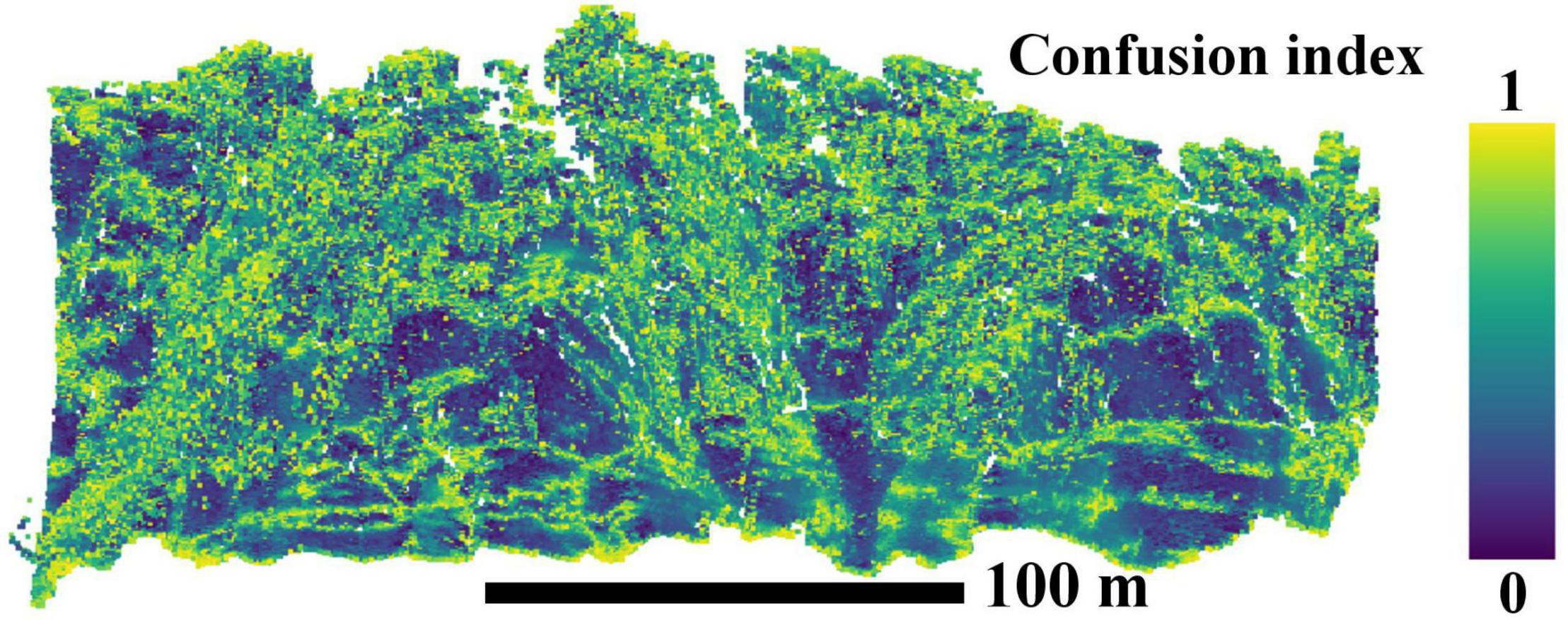 An evaluation of the certainty of assigning the point i to the cluster k and not to another is performed using the confusion index (CI; Burrough et al., 1997). The CI is expressed as the ratio between the data point memberships with the second-closest cluster and the cluster to which it was allocated by the K-means clustering.