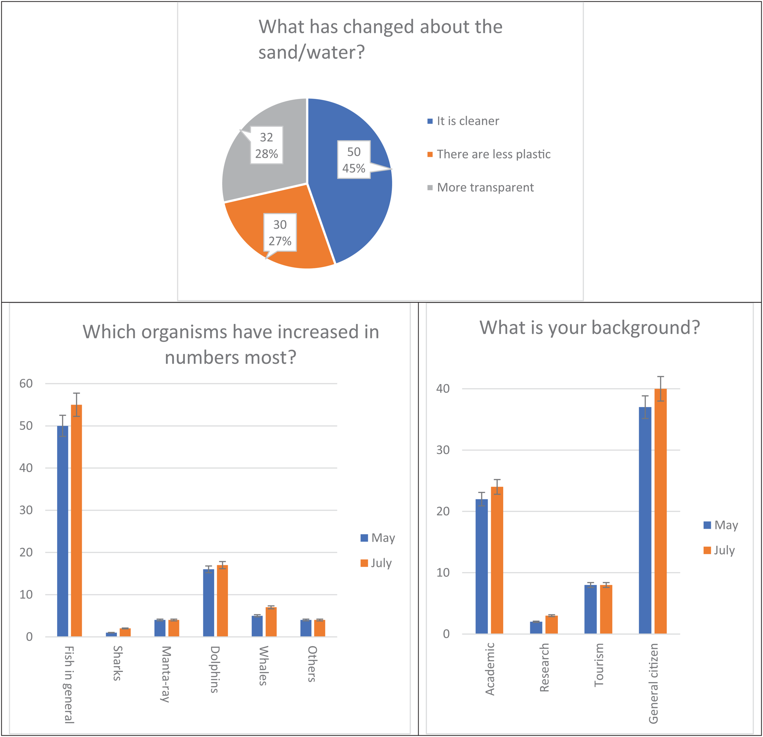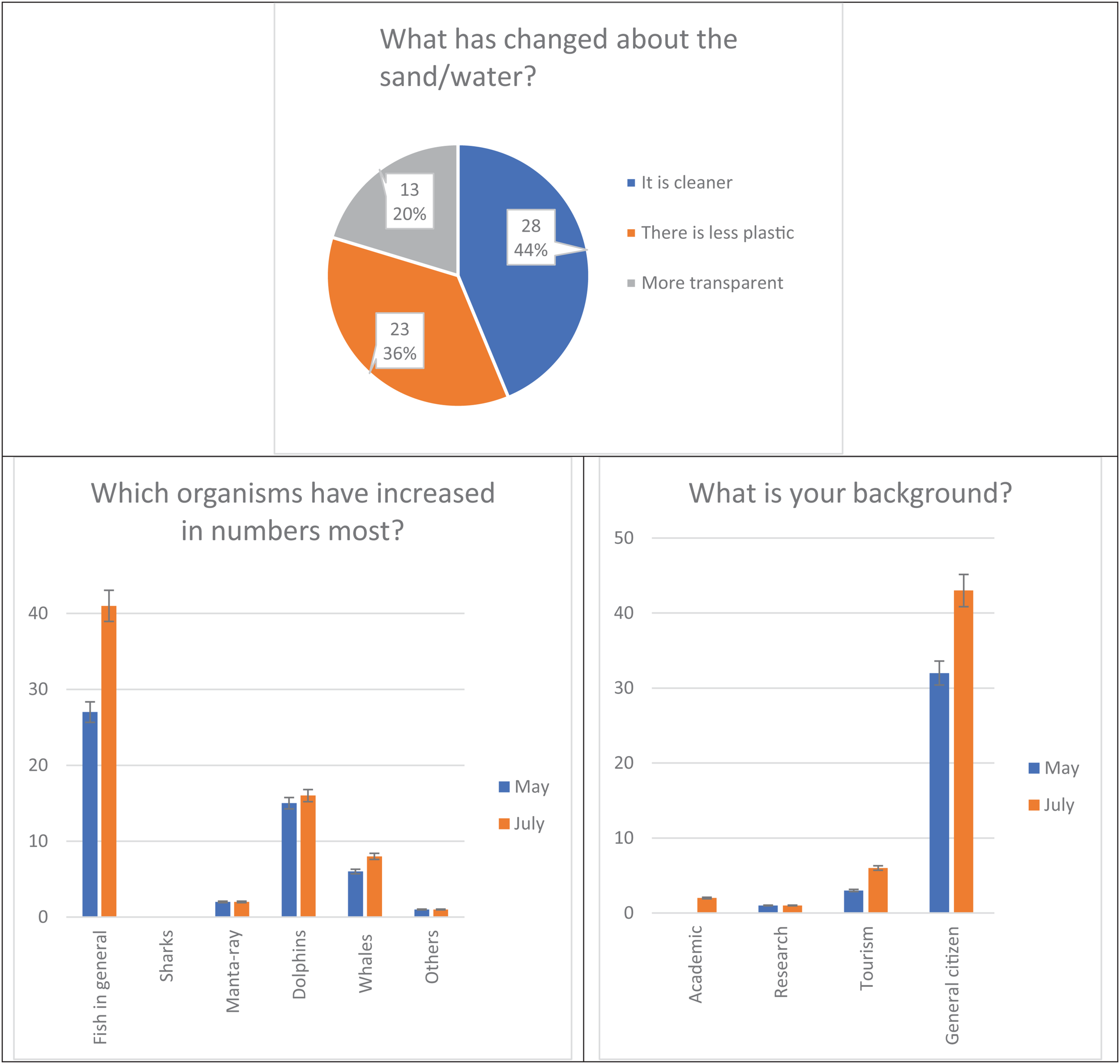The main objective of the surveys was to determine if the perceived quality of the beaches and adjacent waters had improved post, relative to pre, COVID-19 lockdown. Three sets of questions were prepared, one for each location, with those from Salinas and Manta being practically the same, except for one question, while the Galapagos questions were slightly different (see Supplementary Material). The differences reflected variations between the specific locations. The Galapagos islands are at the core of one of the most important marine reserves in the world, and in general its population is much more aware of environmental conditions and the marine species present. Additionally local people rely almost 100% on sustainable tourism and are therefore well educated in environmental matters.