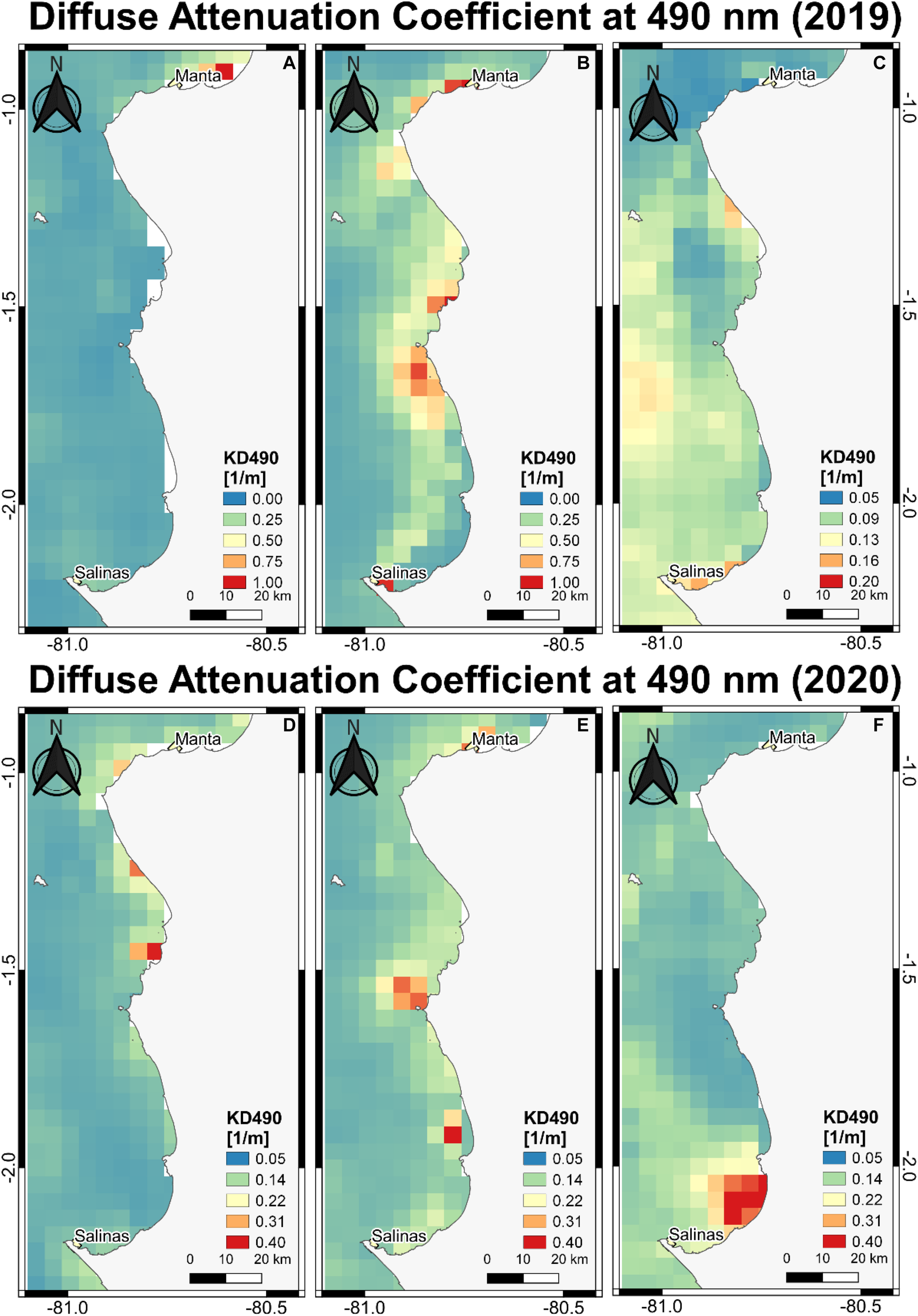 In order to support the qualitative surveys, quantitative data and information from the NASA satellite instruments Terra (EOS AM-1) and Aqua (EOS PM-1), which are payloads for the “Moderate Resolution Imaging Spectroradiometer – MODIS” (NASA, 2019), were used to measure temporal and spatial changes of chlorophyll and the diffuse attenuation coefficient Kd (490 nm), over the timescale of the study.