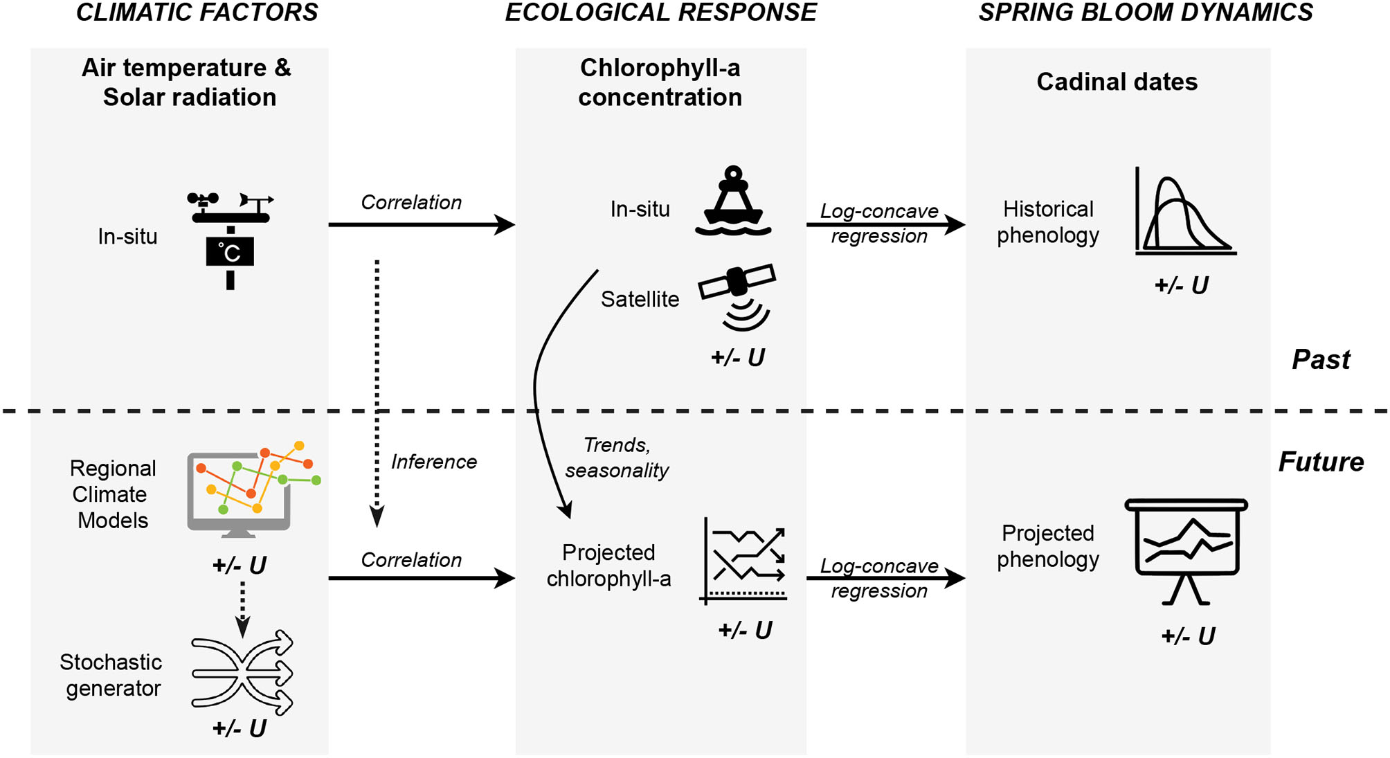 Figure 1 presents the methodological framework and summarizes the connections between elements. Our research aims to study changes in phytoplankton phenology based on historical data and future climate projections. Given the historical records of chlorophyll-a concentrations obtained from various data sources, one can extract the cardinal dates of the spring bloom for the past decades using the proposed feature extraction technique. Furthermore, changes in the spring blooms may be projected for the future by utilizing the correlation between climatic factors, represented by air temperature and solar radiation, and the ecological response, indicated by the chlorophyll-a concentration. This correlation can be inferred from past records since air temperature and solar radiation were measured by field sensors for the past decades. Though future chlorophyll-a concentrations are not available to us, we attempt to make projections using the trends and seasonality from historical observations and taking into account the correlations with projected air temperature and solar radiation, produced by regional climate models. While this methodological framework allows us to investigate past and projected spring bloom dynamics, we note that there are several sources of uncertainties, both data and model related ones, which are propagated through the steps. These uncertainty sources (±U) are marked in Figure 1. In order to address this issue, we aim to use transparent statistical approaches that allow us to quantify intrinsic uncertainties. Noting that the projected trends in bloom metrics constitute the main findings of the research, the importance of the uncertainty quantification framework should also be emphasized, which should always go hand-in-hand with climate change impact studies.