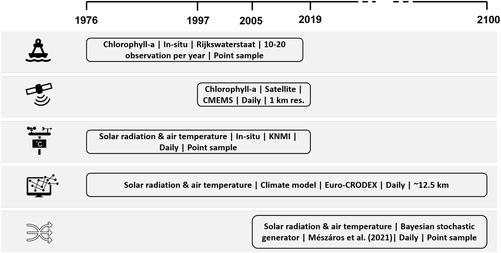 Available climate models offer us a range of (atmospheric) climate variables that could be considered as external drivers influencing phytoplankton seasonality. The climate variables include air temperature, precipitation, solar radiation, eastward and northward wind, air pressure, humidity, and cloud cover. In this study we focus on air temperature and solar radiation that were found to be the most influential atmospheric variables affecting coastal chlorophyll-a concentrations in the Dutch coastal waters, along with wind speed (in shallow systems). This conclusion was reached by applying various statistical techniques to explore temporal, spatial, and functional correlations from the historical atmospheric and chlorophyll-a time series at this location.