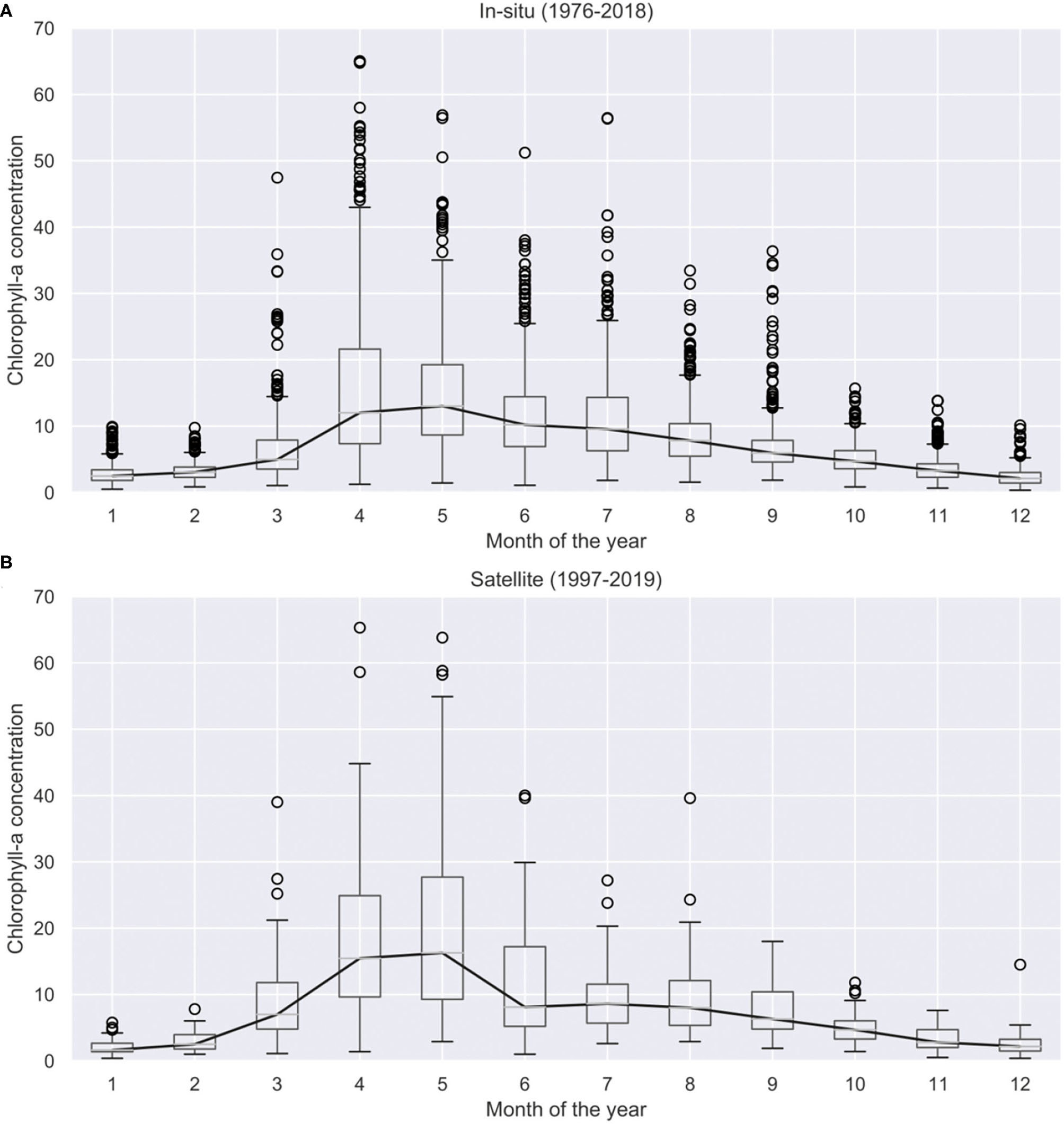 Historical chlorophyll-a concentrations measured in the Dutch Wadden Sea using in-situ data between 1976 and 2018 (A) and satellite images between 1997 and 2019 (B). Climatological median (solid black line) per calendar is also shown.