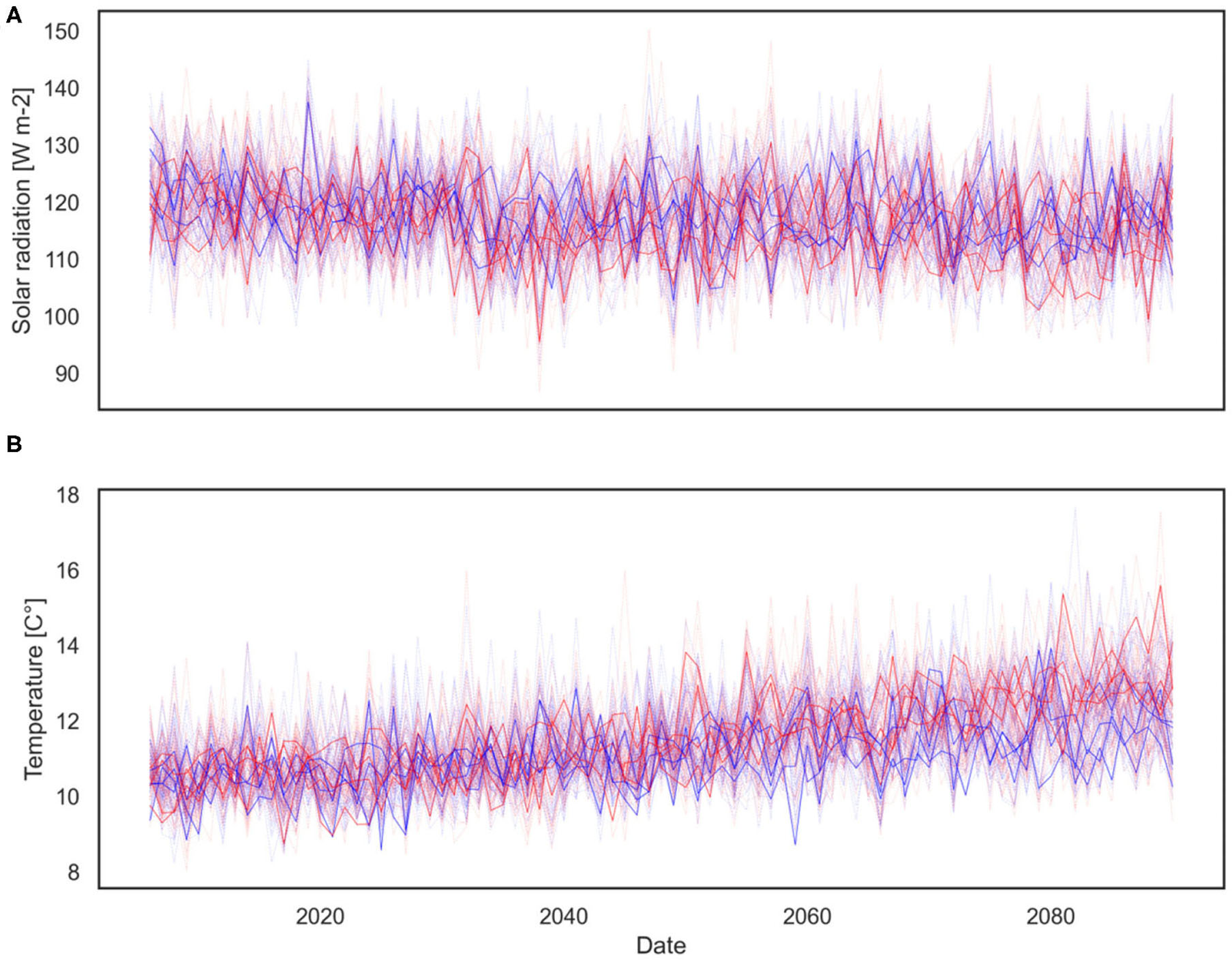 Eight EURO-CORDEX (darker solid line) and 120 generated synthetic (shaded dashed line) climate change projections for solar radiation (A) and air temperature (B), grouped by RCP scenarios (blue—RCP4.5, red—RCP8.5). Plot of the yearly averages based on the daily data.