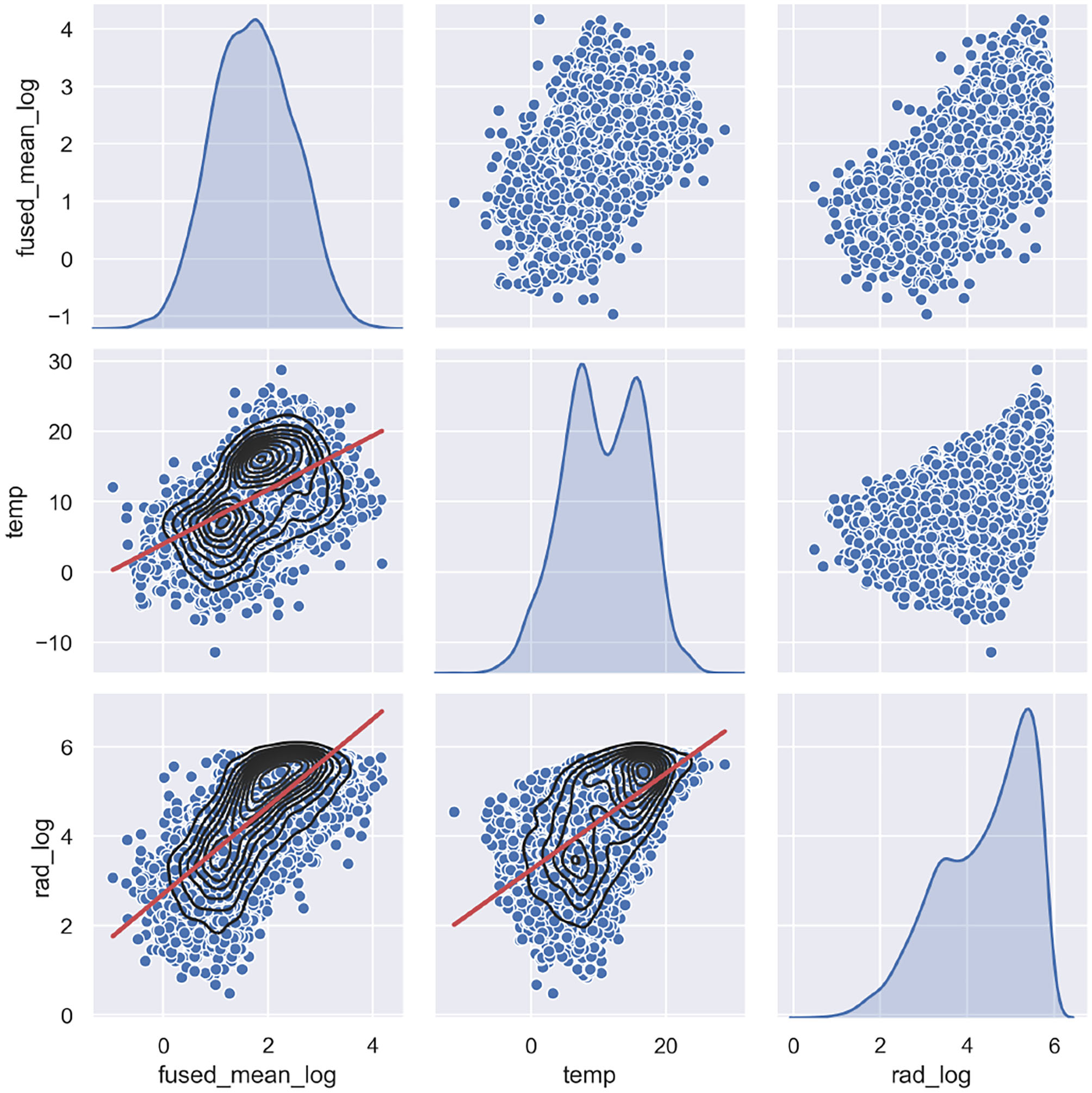 Pair plots of the log transformed response variable (fused chlorophyll-a), and the explanatory variables (log transformed radiation and temperature). Scatter plots are shown together with Kernel Density Estimates (black) and linear regression (red).