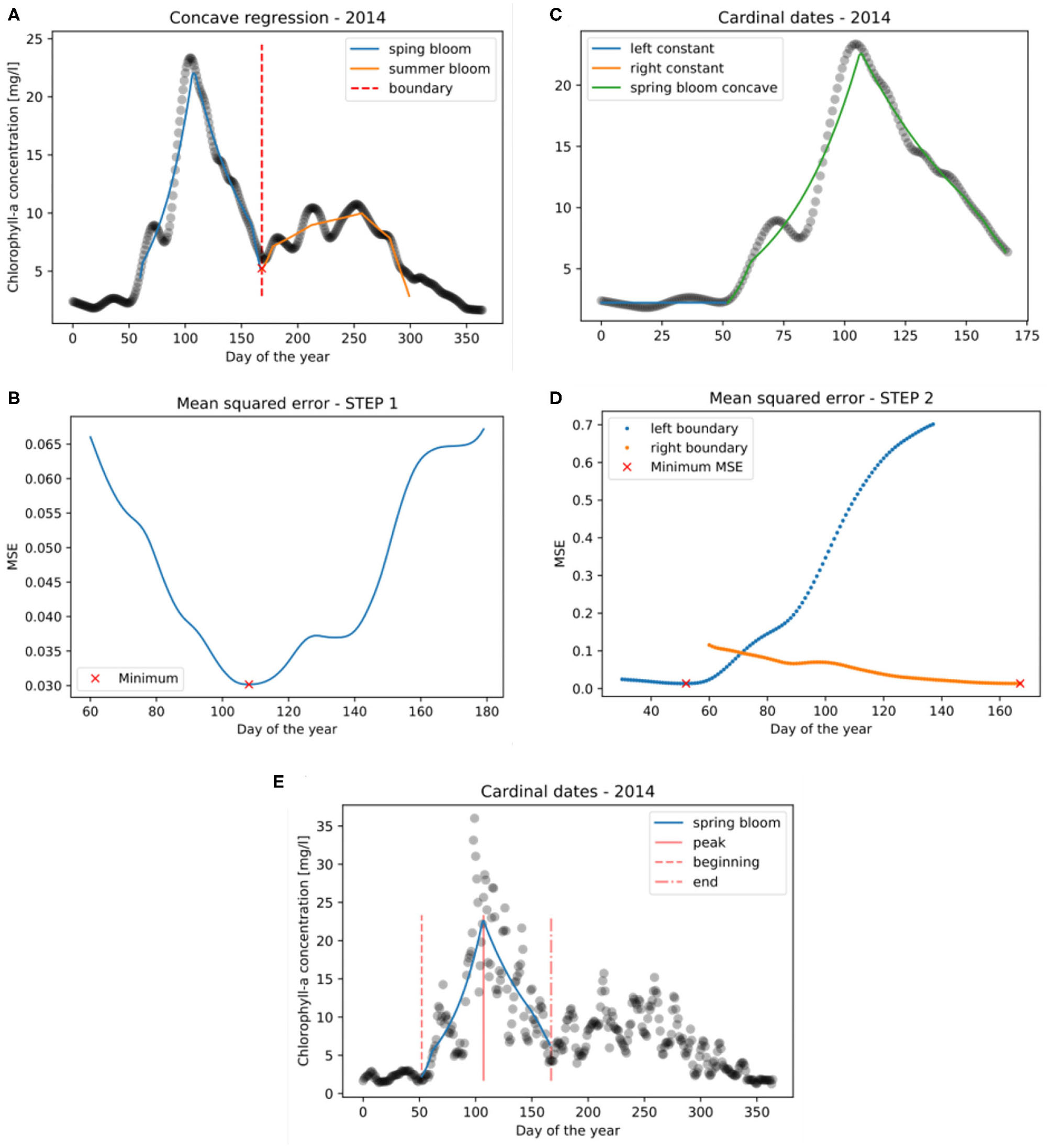 Utilizing this concave regression setup, the following two methodological steps are taken to identify the spring bloom cardinal dates (see Figure 7). The cardinal dates are the spring bloom beginning (B), -peak (P), and -end (E) dates expressed as the day of the year.