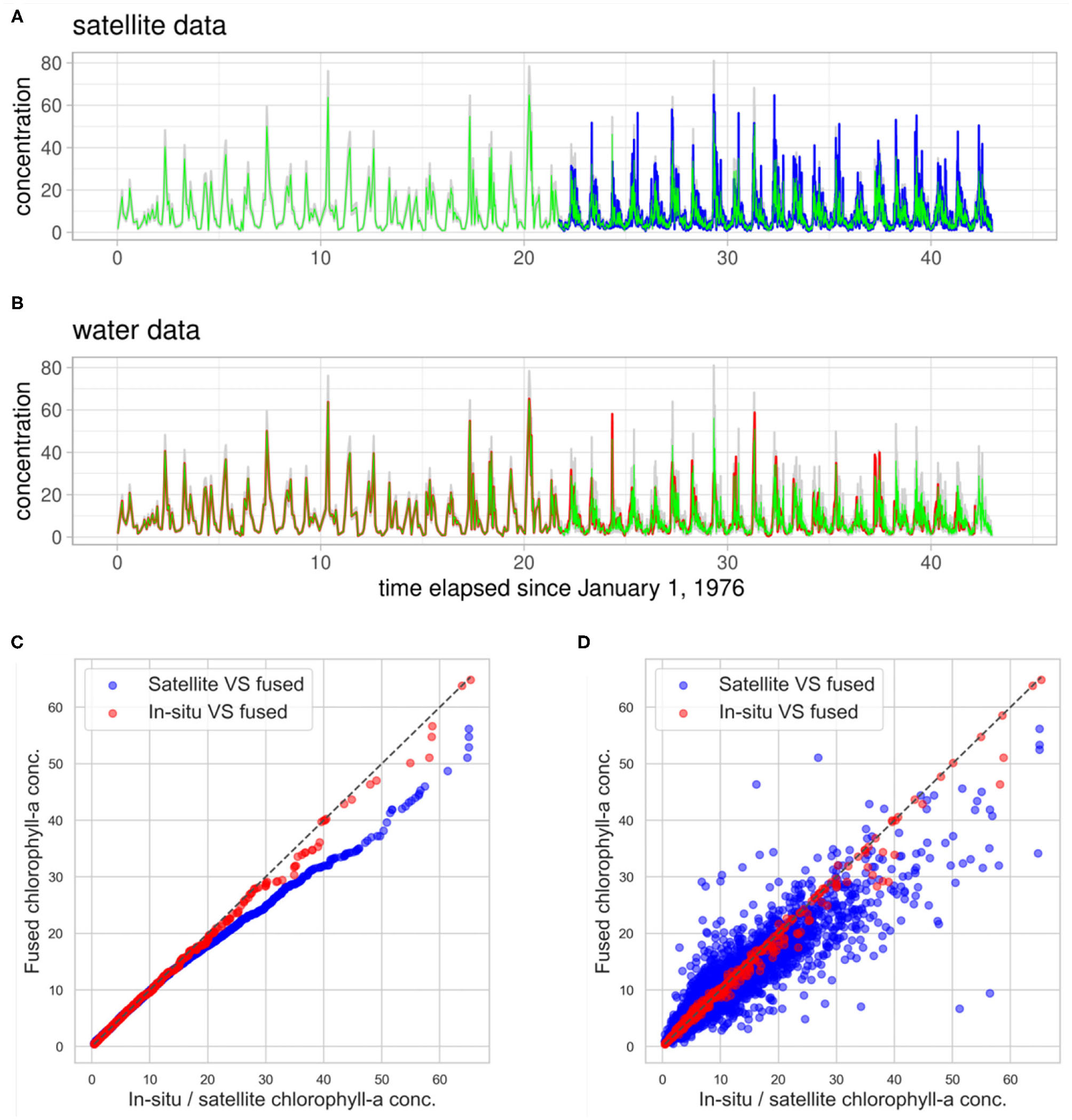 Since the two types of chlorophyll-a measurements describe the same underlying process, we propose a data fusion model to combine them. This data fusion model interlaces the in-situ and satellite observations into a single chlorophyll-a concentration signal, which is more complete then the individual observations and covers a longer time period. The data fusion model is described in section 2.2.