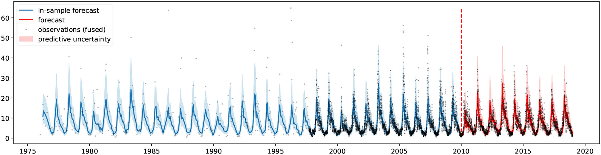 In the current structural time series model implementation the following components are used. Linear trend with change points (change point prior scale is defined), multi-period seasonality: decadal, yearly, half-yearly, and quarterly (periodicity, Fourier order, and prior scale are defined), as well as four additional regressors (air temperature, solar radiation, and their lag1). It should be noted, that adding more than lag1 of the regressors did not improve the prediction further. The parameter inference can be either done by optimization, using Limited-memory Broyden-Fletcher-Goldfarb-Shanno algorithm (L-BFGS) to find a maximum a posteriori estimate, or through full posterior inference to include model parameter uncertainty in the forecast uncertainty.