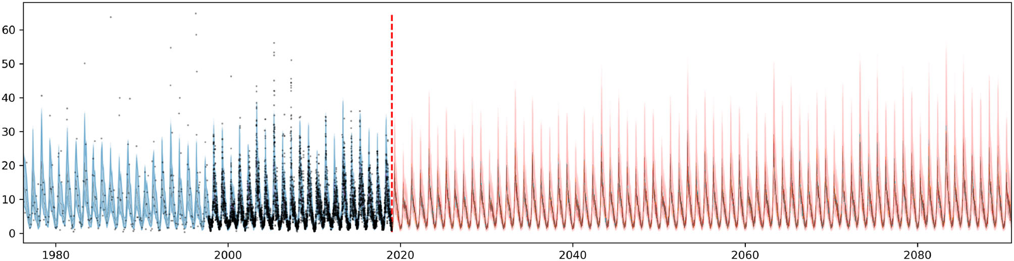 Once λ has been inferred from the data, we use this model to simulate possible future trends and to compute uncertainty intervals. Due to the assumptions in the trend forecasting (matching historical frequency and magnitude) the trend intervals may not be exact, nevertheless they provide an indication of the level of uncertainty and also reveals trend model overfitting.