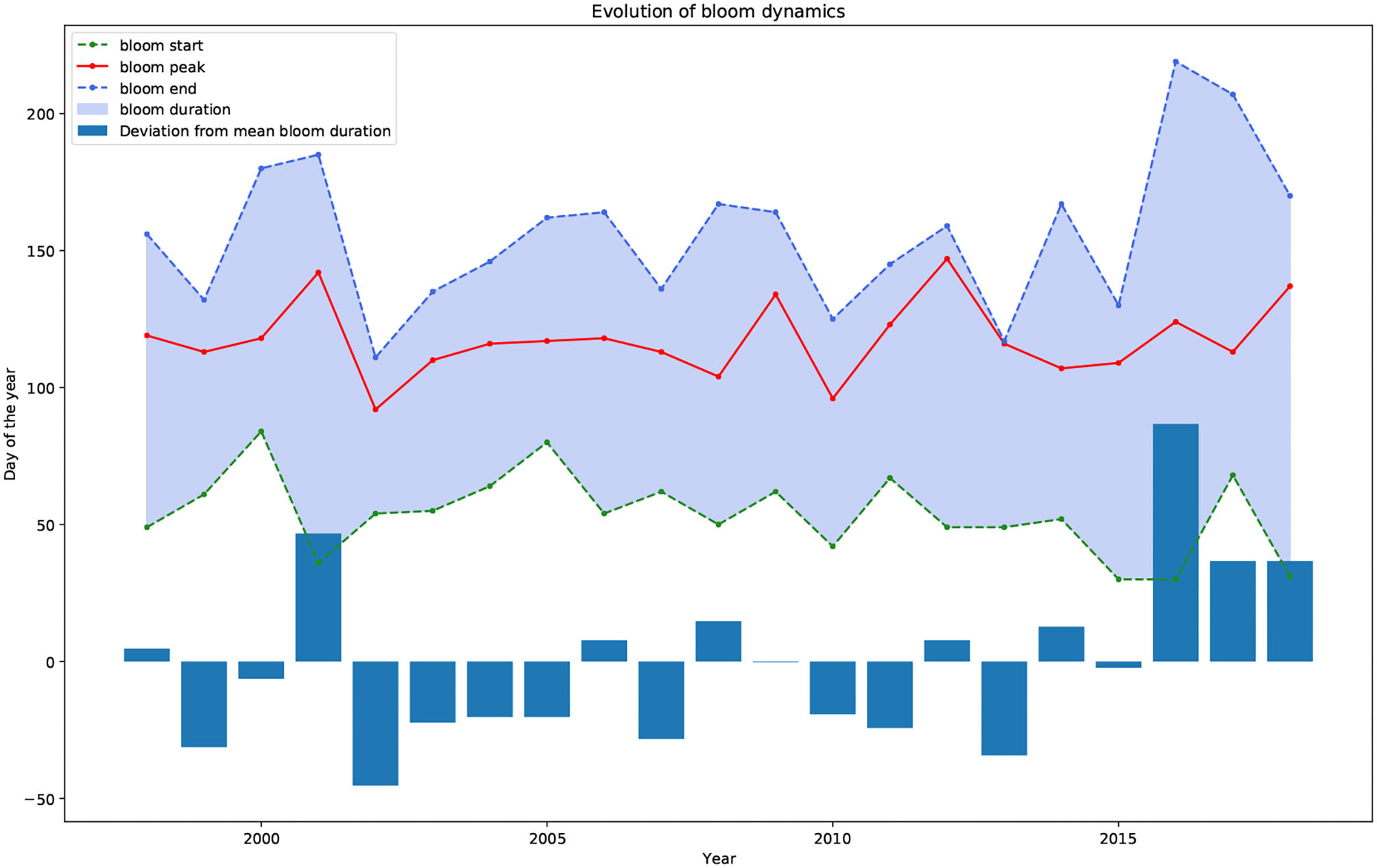 In order to track phytoplankton spring bloom dynamics, the last step of the methodological framework focuses on deriving spring bloom metrics obtained from the chlorophyll-a concentration time series. We must emphasize that uncertainty in the previous methodological steps (data fusion and long term projection) is being propagated to the estimates of cardinal dates and bloom magnitude. Although efforts have been dedicated to quantify these uncertainties, propagated uncertainty carries implications for the accuracy of the calculated cardinal dates.