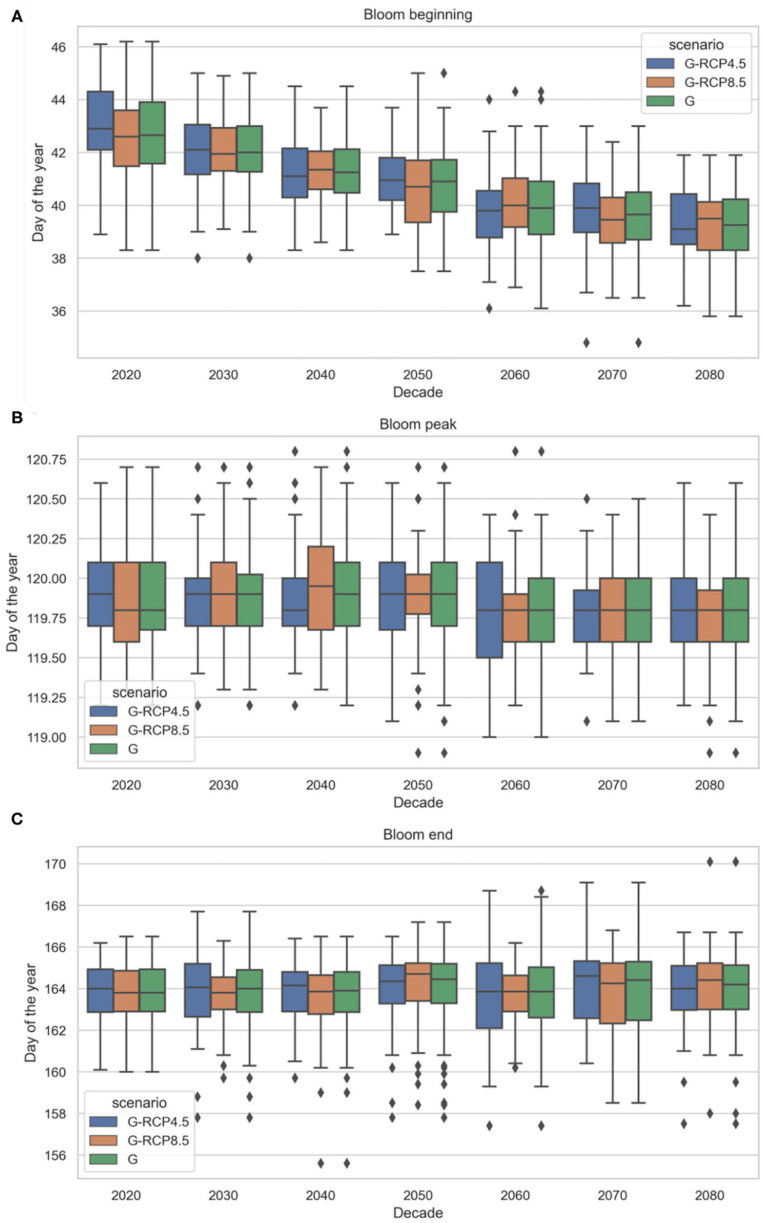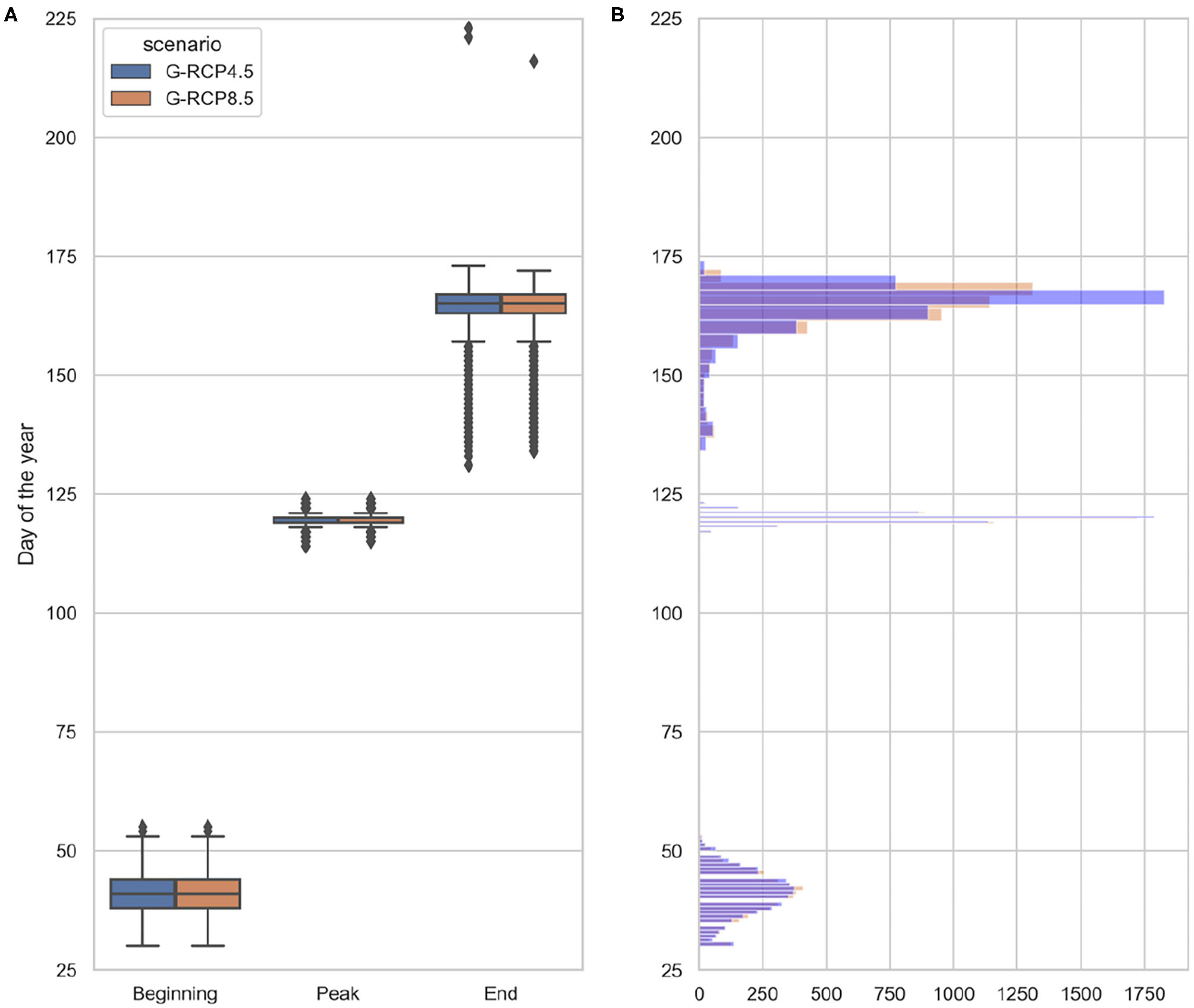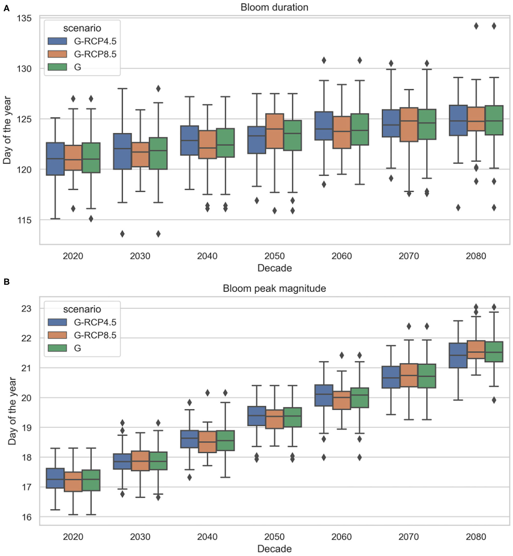 This ensemble of climate trajectories is used to simulate a range of possible phytoplankton seasonality shifts and the associated uncertainty described by the predictive distribution of the phytoplankton bloom cardinal dates. It should be noted that applying only eight climate projections reduces the ability to adequately resolve the unknown predictive distribution that one tries to estimate, hence, higher number of climate trajectories providing sufficient resolution in terms of probabilities is required (Leutbecher, 2019). Consequently, to better characterize uncertainties, an enriched set of climate change projections is employed. This set of air temperature and solar radiation projections was produced using a Bayesian stochastic generator (Mészáros et al., 2021), which builds on the above mentioned Regional Climate Model scenarios provided by the EURO-CORDEX experiment and generates further synthetic scenarios using a hierarchical Bayesian model. The generated ensemble of air temperature and solar radiation projections include 120 members and their statistical properties are similar to the input projections. Both the EURO-CORDEX and synthetic projections are shown for air temperature in Figure 5A and for solar radiation in Figure 5B. At this specific location we can observe a consistently increasing temperature trend over the twenty-first century and a slightly decreasing solar radiation trend. While increasing air temperatures are in line with expectations, decreasing solar radiation trends may need further explanation. The main cause of this negative trend is the fact that total cloud cover at this site is projected by EURO-CORDEX to increase, hence, limiting surface downwelling shortwave radiation. This is a region specific feature, and the difficulty of projecting cloud cover and solar radiation changes in coastal areas with sea-land-atmosphere boundaries, such as the study site, has been previously highlighted by Bartók et al. (2017), along with discrepancy between RCMs and their driving GCMs in their solar radiation projections over Europe.
