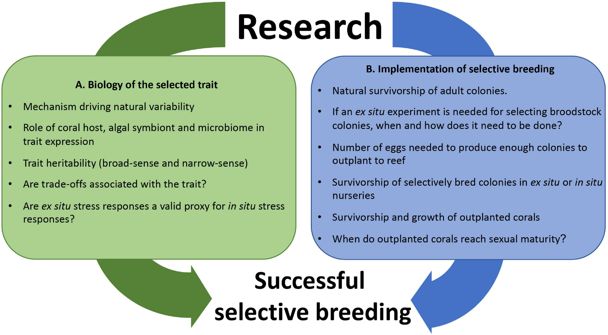 Illustration of research needs for coral selective breeding related to (A) biology of the selected trait, and (B) implementation in the field. It is imperative to develop both research areas simultaneously as the time left to implement these conservation initiatives, given current climate change predictions, is very short (20–30 years).