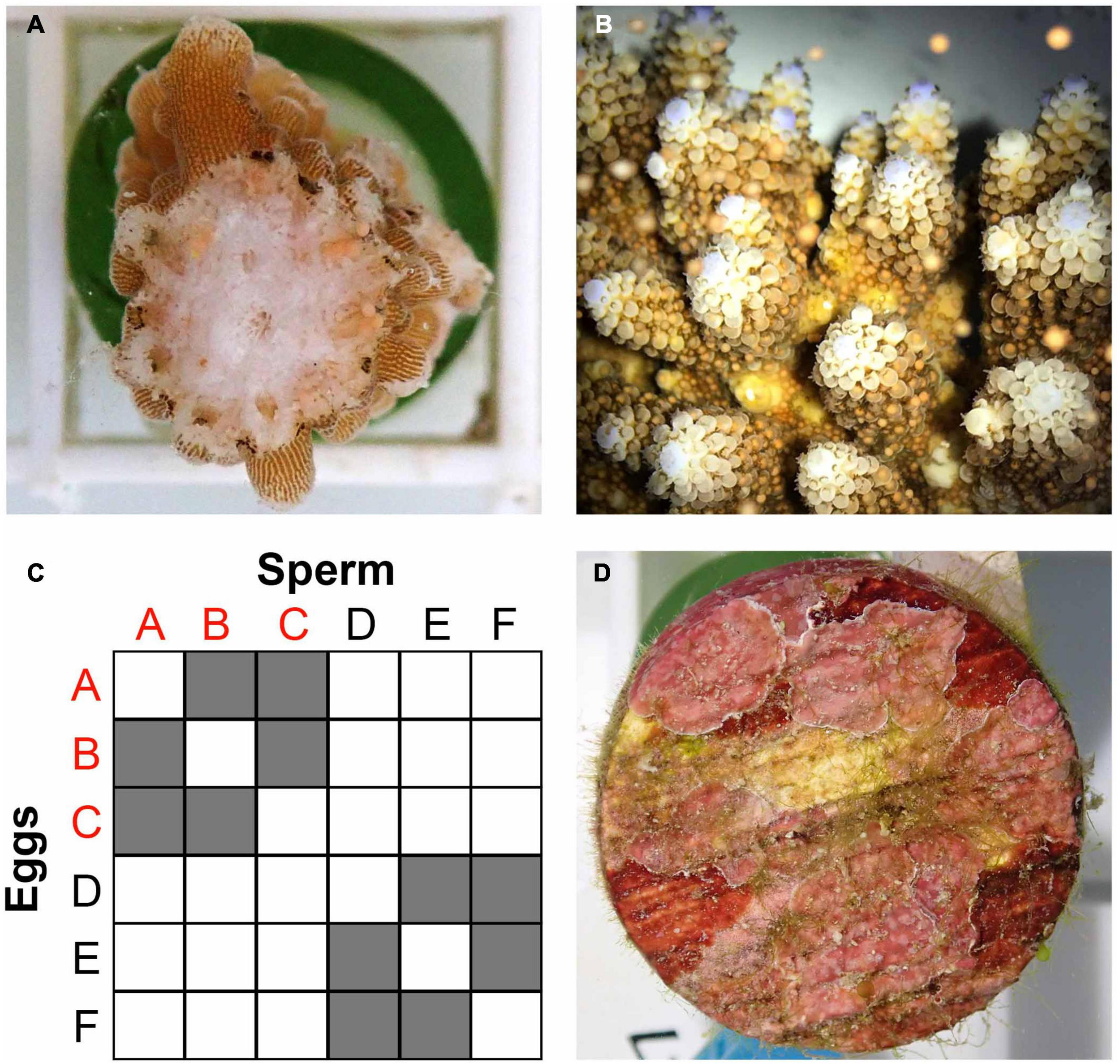 Circular ceramic substrates (Oceans Wonders LLC) ∼2 cm in diameter with a 1.5 cm stem (hereafter referred as substrate units “SUs”), overgrown with crustose coralline algae (CCA; Figure 2D) were offered to the larvae for settlement. The SUs had been biologically conditioned for four months (130 days) before spawning in two 300 L holding tanks with flow-through water mixed using four pumps each (Taam Rio +800 Powerhead). SUs were arranged on plastic egg crates raised from the bottom of the tank, with fragments of CCA collected at Mascherchur placed on top of the SUs. To stimulate growth of CCA over the SUs and avoid the colonization of filamentous algae, frames with shading cloth were placed over the tanks to reduce light levels to 4 μmol photons m–2 s–1. Three days after fertilization, larvae were transferred from 24 larval rearing tanks to 24 settlement tanks filled up with 10 L of 10 μm FSW and 80 conditioned SUs each. Half of the water in each tank was changed daily with new FSW. Two days after larvae were moved to the settlement tanks, SUs were transferred to flow-through nursery tanks (ex situ nurseries). Each SU was tagged with a cable tie using a color coded system to identify from which cross and replicate culture the colonies had originated (resulting in 24 color codes from 12 crosses).