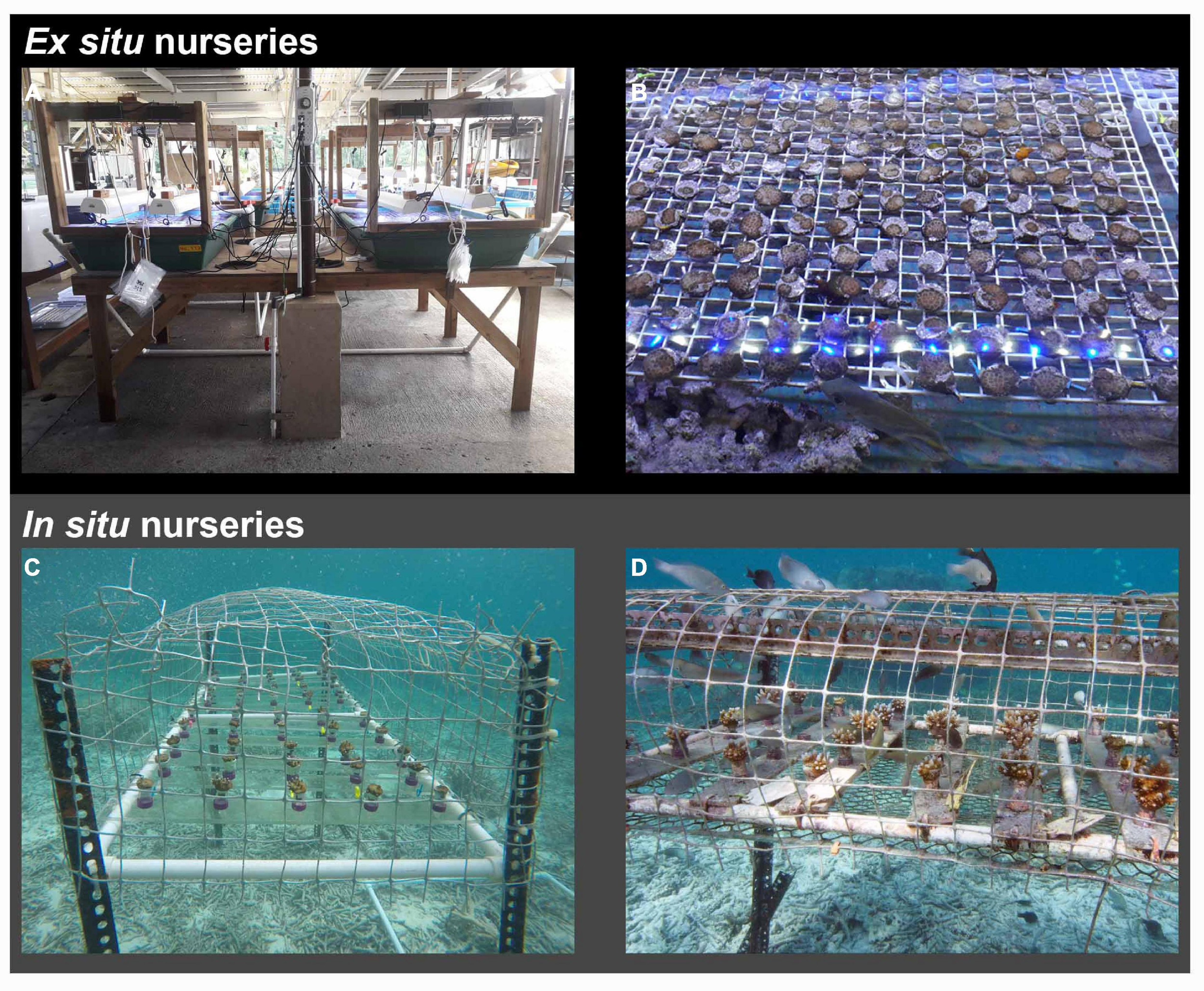 (A) Ex situ nursery tanks, (B) detail of ex situ nurseries with the presence of herbivores Siganus lineatus.(C) Coral colonies when transferred from the ex situ to the in situ caged nursery (13-months old). (D) Corals (17-months old) in the in situ nursery showing the presence of small herbivore fish within the cage.