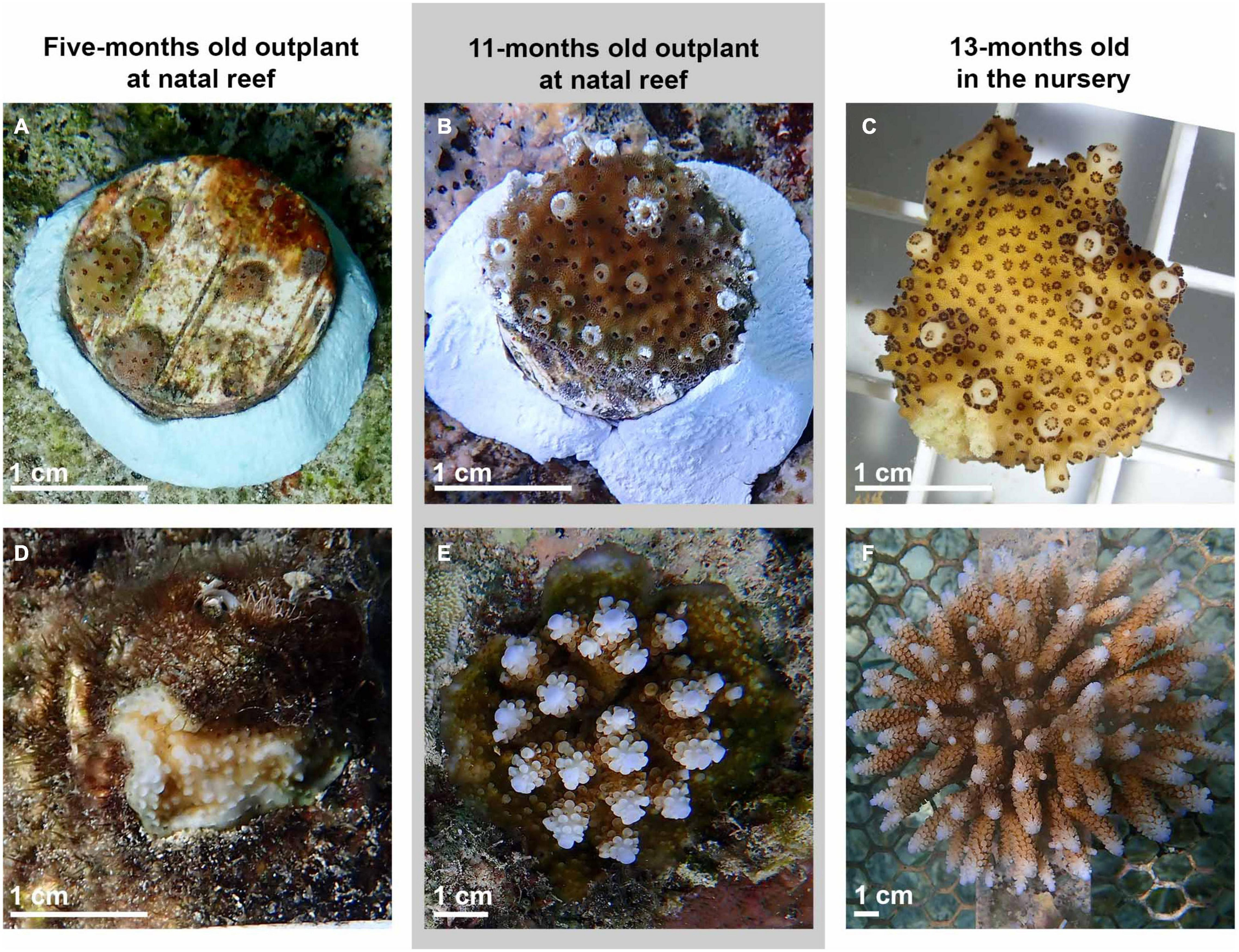Images showing representative colonies to illustrate differences in size and morphology at the time of outplanting to the reef, or transfer to the in situ nursery (A: 5-month old outplant, B: 11-month old outplant, and C: 13-month old before transferring to the in situ nursery), and during the last monitoring (D: 5-month old outplant, E: 11-month old outplant, and F: in situ nursery) when colonies were 2.5 years old (52 days after the spawning event of 2020).